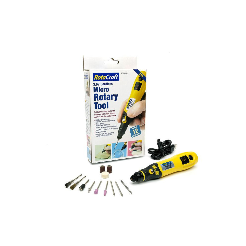 Rotacraft fúrómaró RC03 12 szerszámmal és beépített LiIon 3,6 V-os akkumulátorral. A könnyű kézi marómaró három fordulatszámmal rendelkezik: 5000/10000/15000 rpm, 2,3 mm-es tokmány és 12 különböző forgószerszám áll rendelkezésre. Ideális precíz, összetett munkákhoz gravírozáshoz, csiszoláshoz, polírozáshoz stb. Könnyű súlya miatt a vele való munka nem fárasztja el. Az akkumulátor feltöltéséhez USB-kábelt mellékelünk.