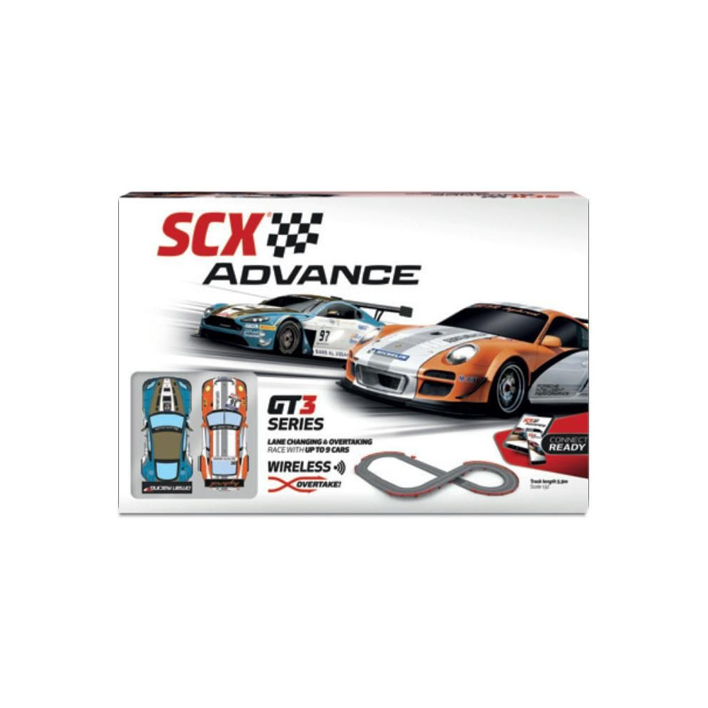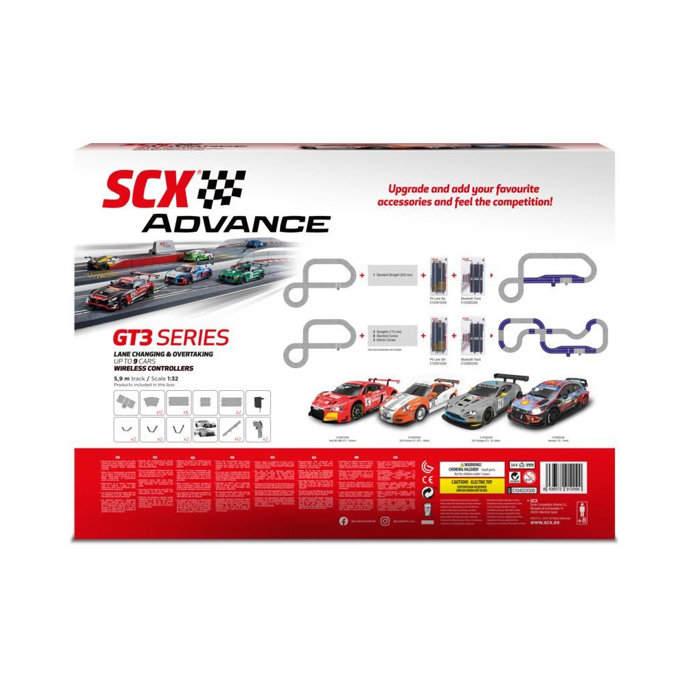 Az SCX Advance GT3 Series 2.0 elektromos versenypálya klasszikus 1:32 méretarányban az izgalmasabb versenyzésért - kiváló digitális pálya előzésekkel a kereszteződéseknél (a vezető által vezérelt fordulóknál), híddal és akadályokkal. A csomag tartalmaz két vezeték nélküli, kapcsolóval ellátott vezérlőt, két részletes, digitális SCX Aston Martin Vantage GT3 - NBO és SCX Porsche 911 GT3 - Hybrid pályaautót, amelyek LED-es lámpákkal vannak felszerelve. Elrendezési terület: 220 x 184 cm. A pálya nagyon könnyen összeszerelhető, össze kell kattintani a pálya részeit, párosítani a versenyzőket az autókkal és már indulhat is a versenyzés.