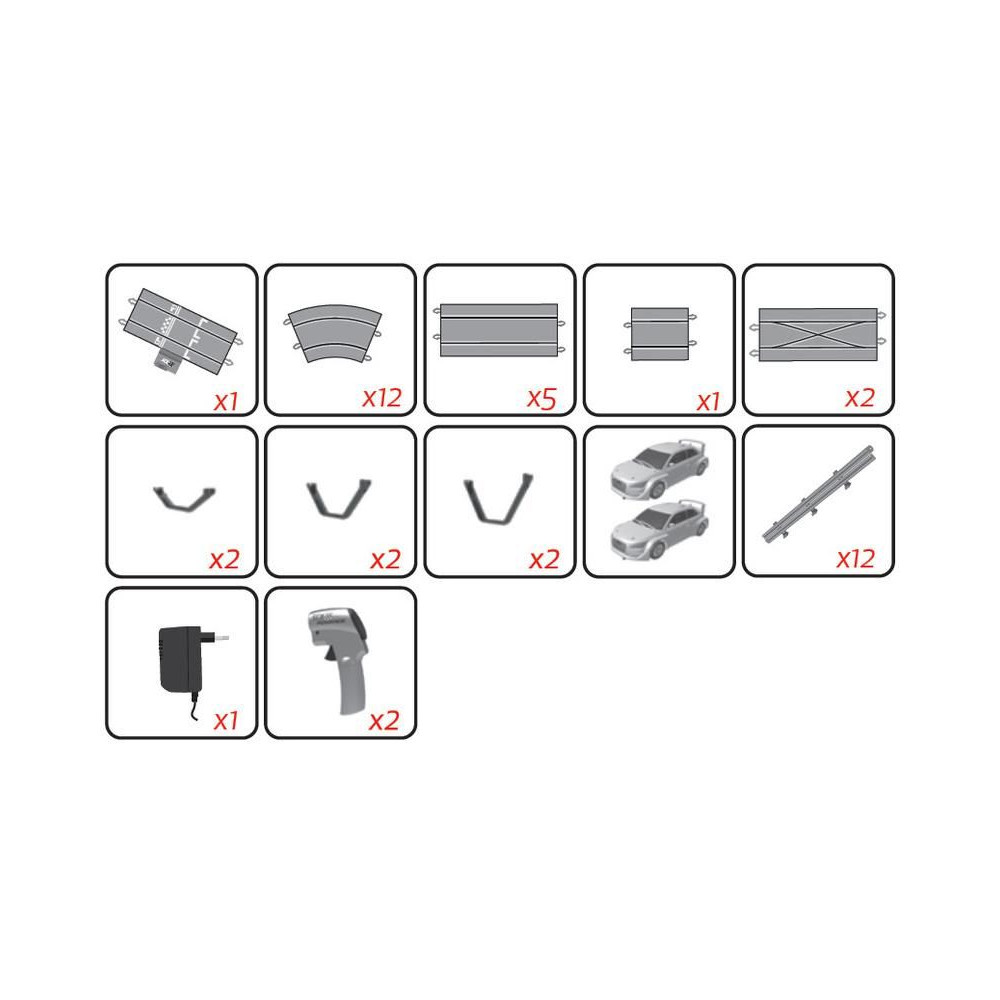 SCX Advance GT3 Series 2.0 klasszikus 1:32 méretarányban - egy kiváló digitális elektromos versenypálya előzési kereszteződéssel, híddal és korlátokkal. Két vezeték nélküli vezérlő váltókapcsolóval, két digitális pályaautóval, két digitális pályaautóval és LED-es lámpákkal. Layout terület: 220 x 184 cm. Pálya hossza: 5,9 m.