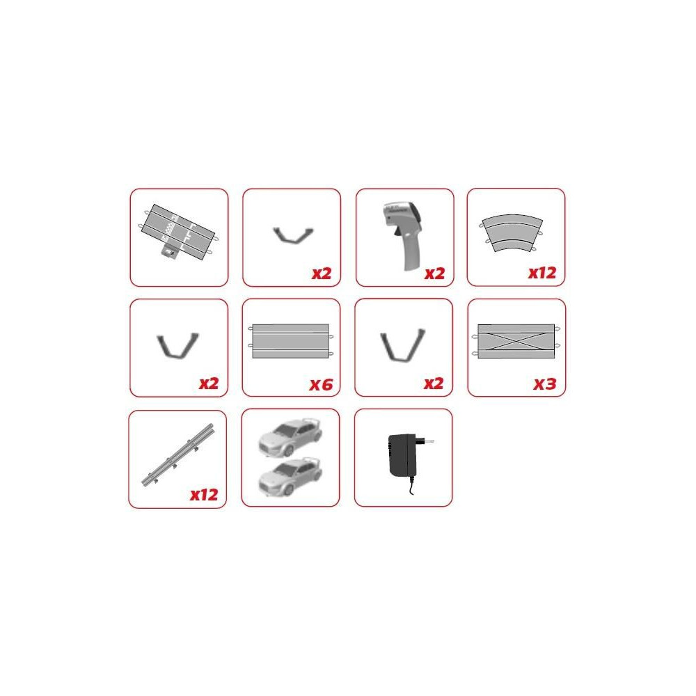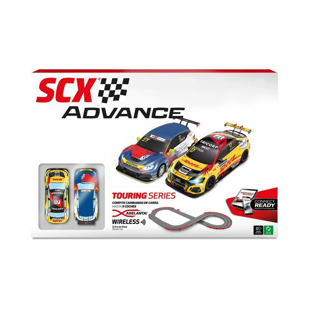 SCX Advance Touring Series a klasszikus 1:32-es méretarányban - egy kiváló digitális elektromos versenypálya előzési kereszteződéssel és csúszdákkal. Két vezeték nélküli vezérlő váltókapcsolóval, két digitális pályaautó váltókapcsolóval, két digitális pályaautó LED-es lámpákkal. Layout terület: 288 x 126 cm. Pálya hossza: 5,9 m.