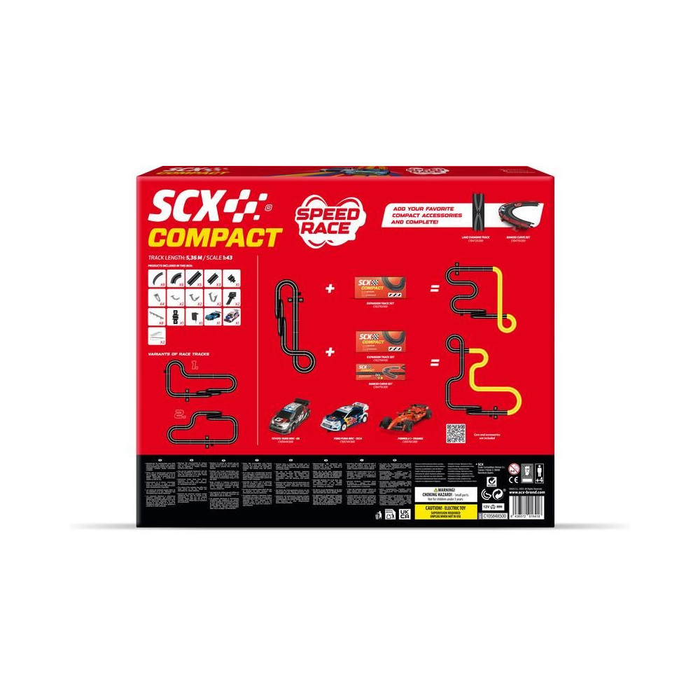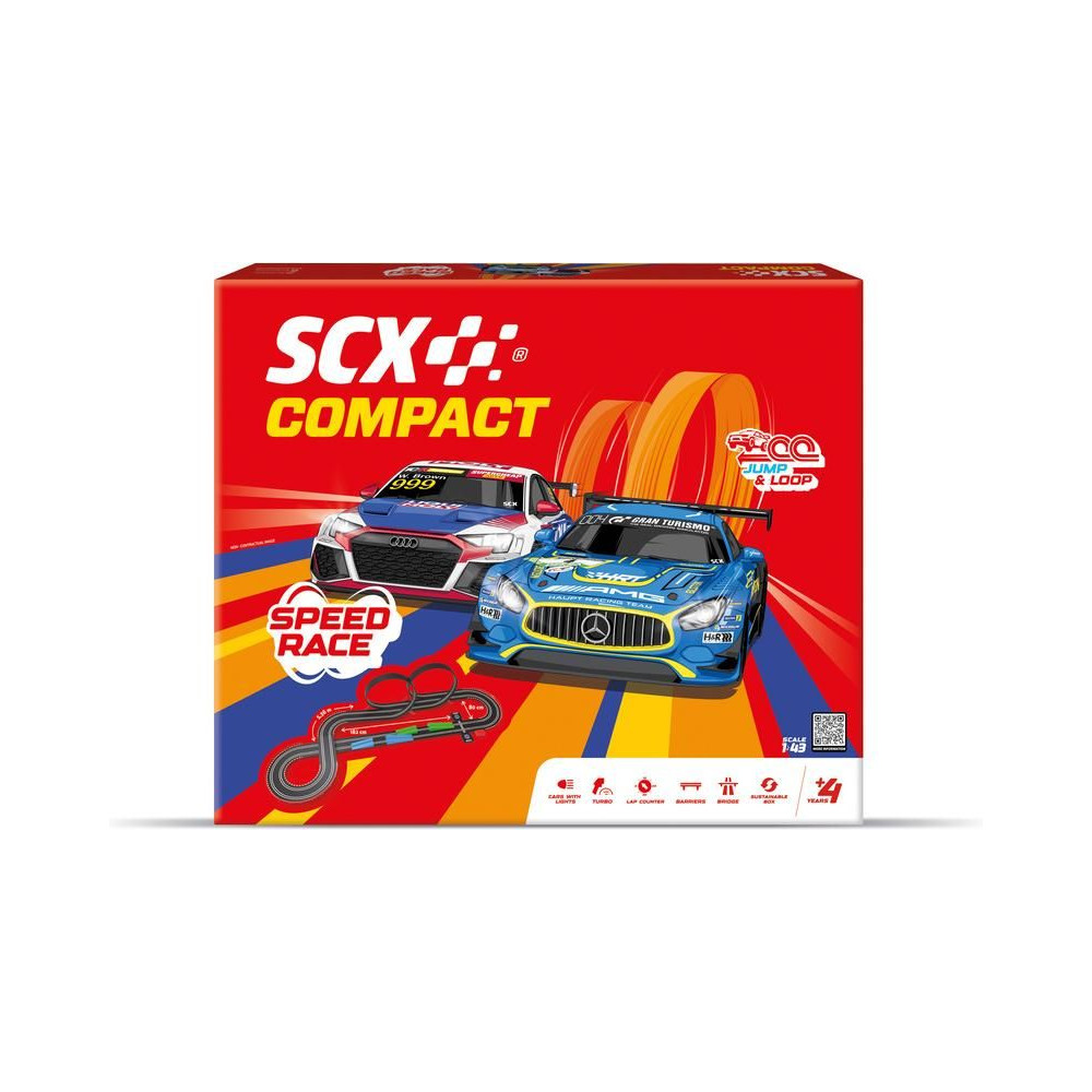 SCX Compact Speed Race pálya 1:43 méretarányban - analóg pálya híddal, akadályokkal, 2x hurokkal, jumperrel és körszámlálóval. Két ergonomikus vezérlő, két részletesen kidolgozott pályaautó világítással , Audi RS3 és Mercedes-Benz AMG GT3. Az alapváltozat kirakásához szükséges terület: 180 x 80 cm. Pályahossz: 5,36 m. A pálya összeszerelése nagyon egyszerű, az egyes pályaelemeket össze kell pattintani, a vezérlőket csatlakoztatni, és máris kezdődhet a verseny.
