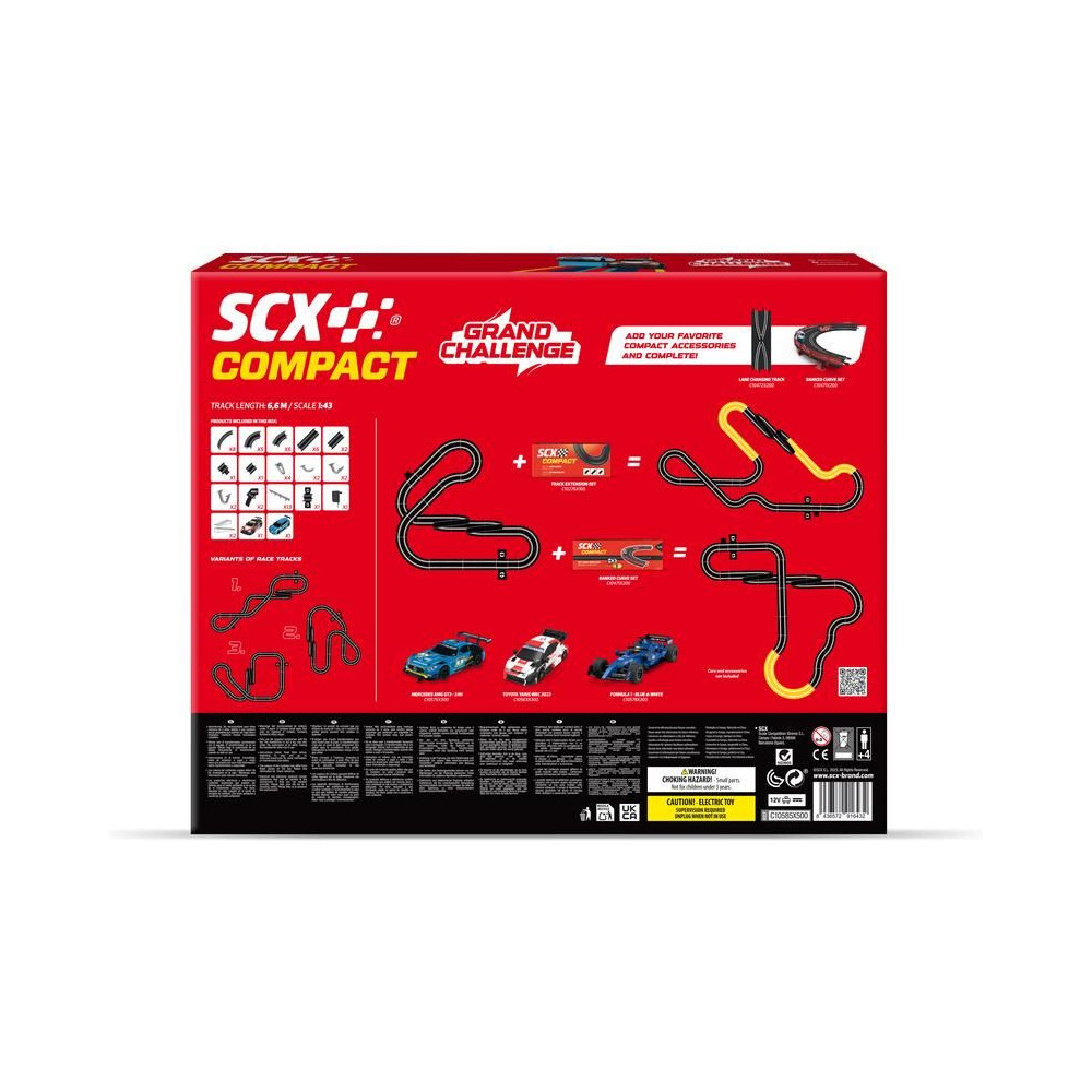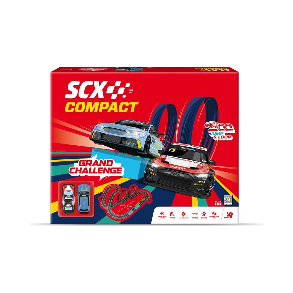 SCX Compact Grand Challenge pálya 1:43 méretarányban - analóg pálya híddal, akadályokkal, 2x hurokkal és ugratókkal. Két vezeték nélküli kontroller , két részletesen kidolgozott pályaautó világítással , Audi RS3 LMS és Cupra. Az alapváltozat terepasztala: 123 x 63 cm. Pályahossz: 6,66 m. A pálya összeszerelése nagyon egyszerű, az egyes pályaelemeket össze kell pattintani, a kontrollereket csatlakoztatni, és már indulhat is a verseny.
