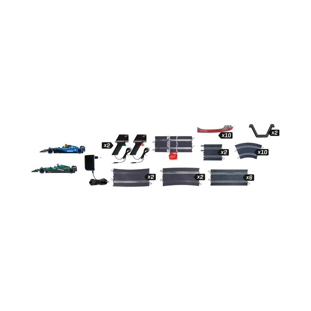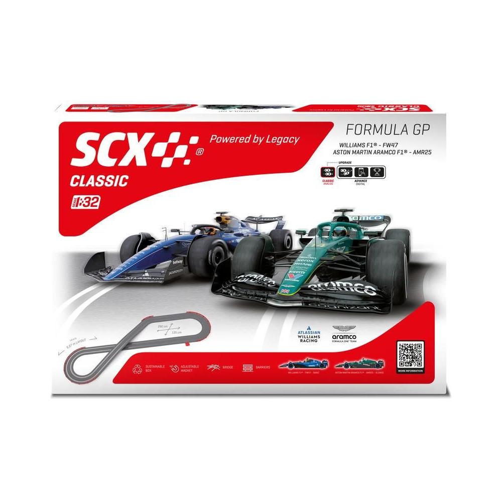 SCX Formula GP autópálya klasszikus 1:32 méretarányban az izgalmasabb versenyekhez - analóg elektromos autópálya híddal és akadályokkal. Két ergonomikus kezelőszerv, két részletesen kidolgozott pályaautó: Aston Martin F1 Alonso és Williams F1 Sainz. Kialakítási terület: 292 x 135 cm. Pálya hossza: 6,67 m.