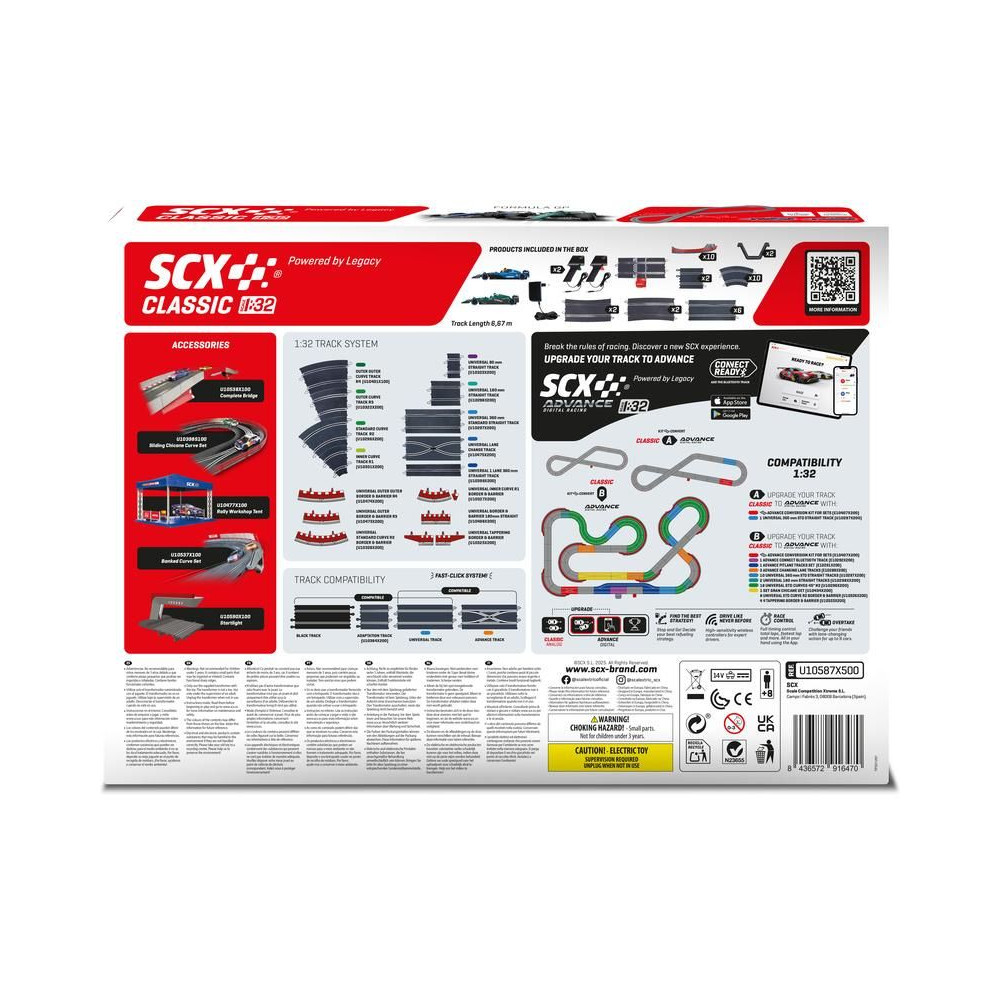 Az SCX Classic autópályák klasszikus 1:32 méretarányban készülnek. Ez a méretarány ideális a valódi és izgalmas versenyekhez, ahol teljes mértékben élvezheted és uralhatod az autók dinamikáját. Az SCX 1:32 pályák ugyanazokkal a pályaelemekkel rendelkeznek, és a pálya fejleszthető és bővíthető. Ezenkívül, ha a versenyzés élvezetes számodra, az SCX Classic pályák digitalizáló készletek segítségével SCX Advance-re fejleszthetők, és élvezheted a digitális pálya összes előnyét és kiterjesztését.