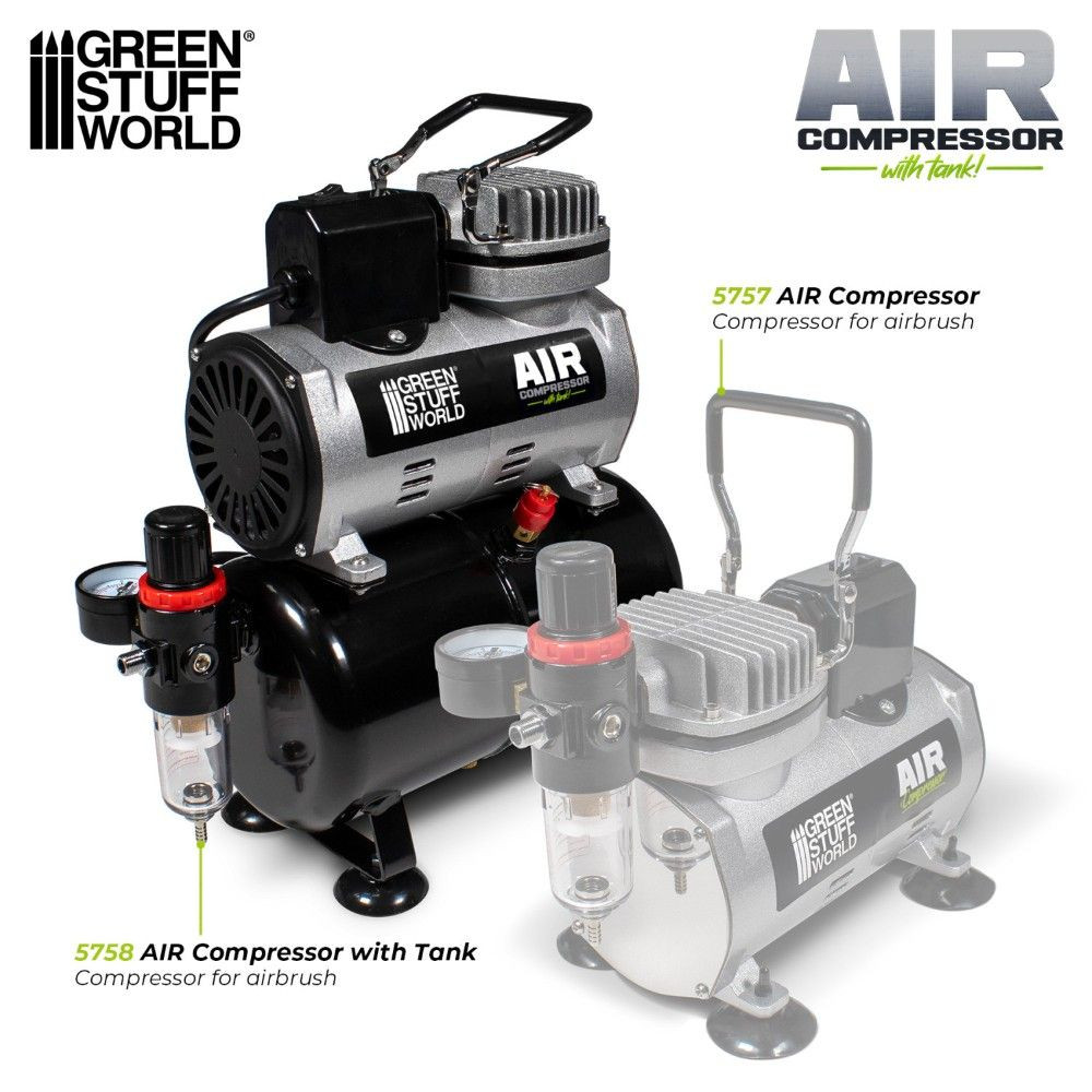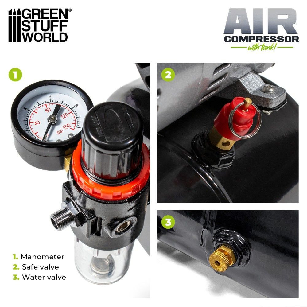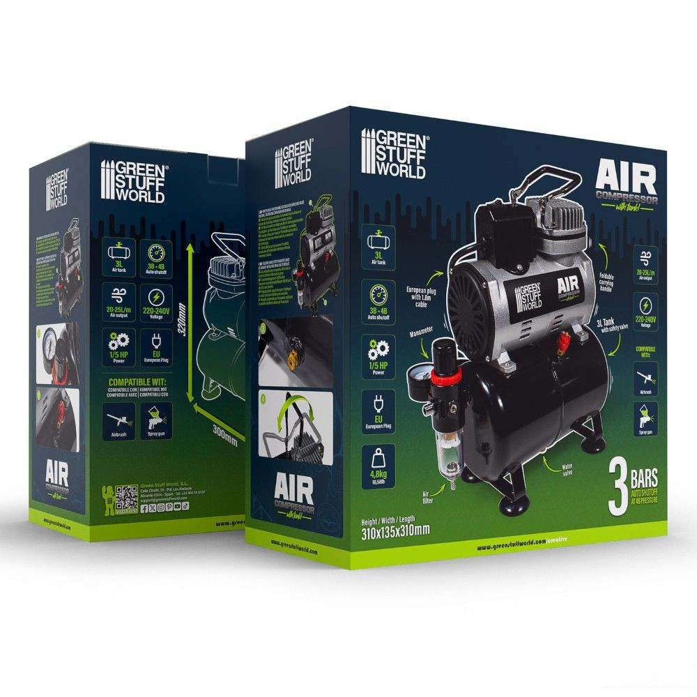 Ez a Green Stuff World kompakt airbrush kompresszor kifejezetten stabil és csendes sűrített levegő biztosítására készült modellezéshez tervezett airbrush pisztolyokhoz. Hatékony, egyhengeres, olajmentes dugattyús motorjának köszönhetően egy 3 literes levegőtartállyal rendelkezik, amely stabil levegőellátást biztosít 20 és 23 liter/perc közötti állandó áramlási sebességgel, 0,16 mm-től 1,5 mm-es fúvókákkal kompatibilis.