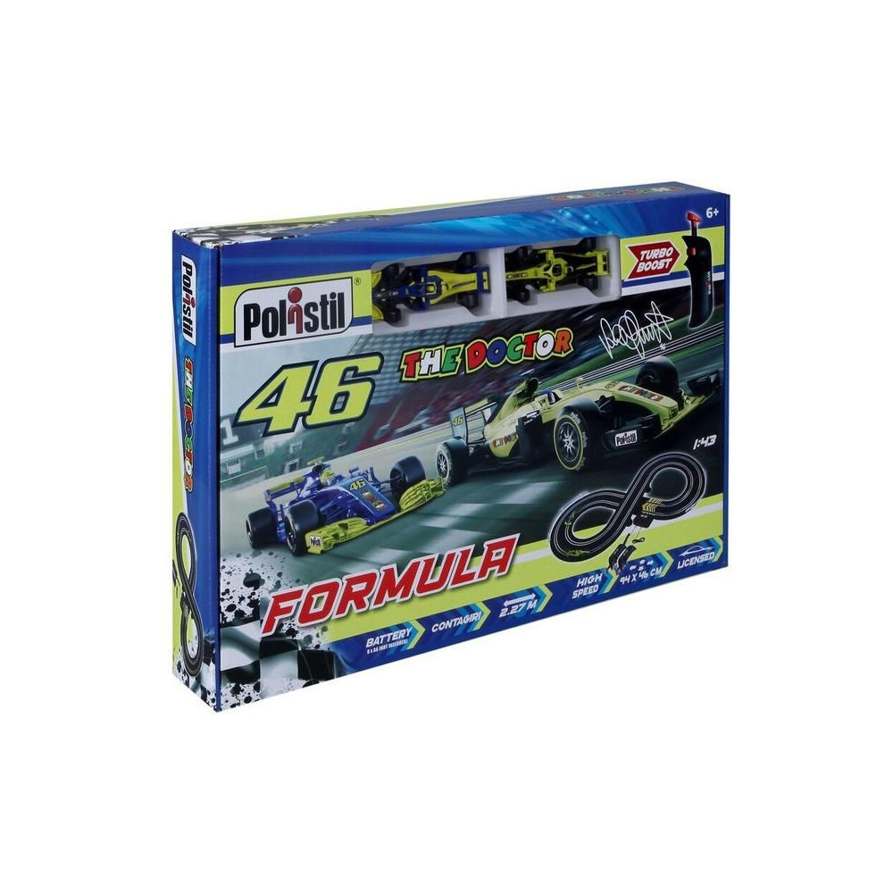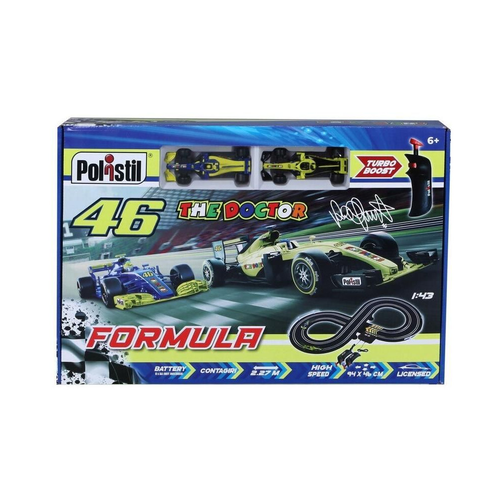 Polistil VR46 Formula Racing - analóg elektromos autópálya 1:43 méretarányban. Klasszikus nyolcas forma híddal a kiegyensúlyozott versenyzéshez. Ceruzaelemekkel működtethető. Formula autók Valentino Rossi "46 The Doctor" témával. A pálya hossza 2,27 m, az elrendezési terület 94 x 46 cm.