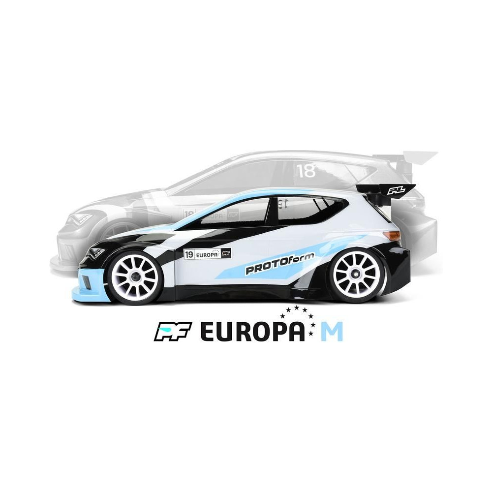 Karosszéria Protoform clear Europa 190mm Touring Car (FWD Class) RC autó modellekhez 1:10, tengelytáv 255-260mm, hossz 423mm, szélesség 193mm. Tartós lexanból készült, szerelési tartozékokkal.