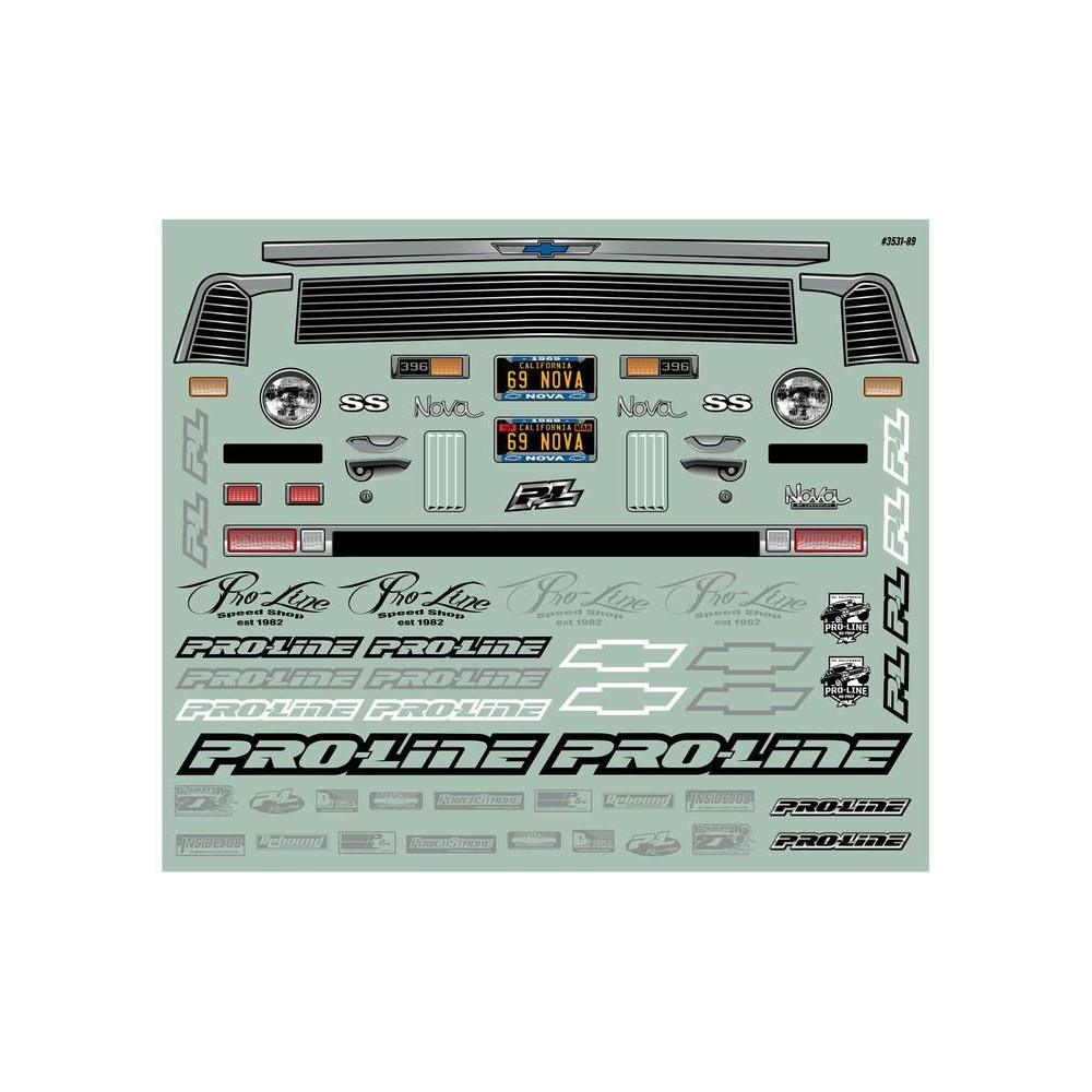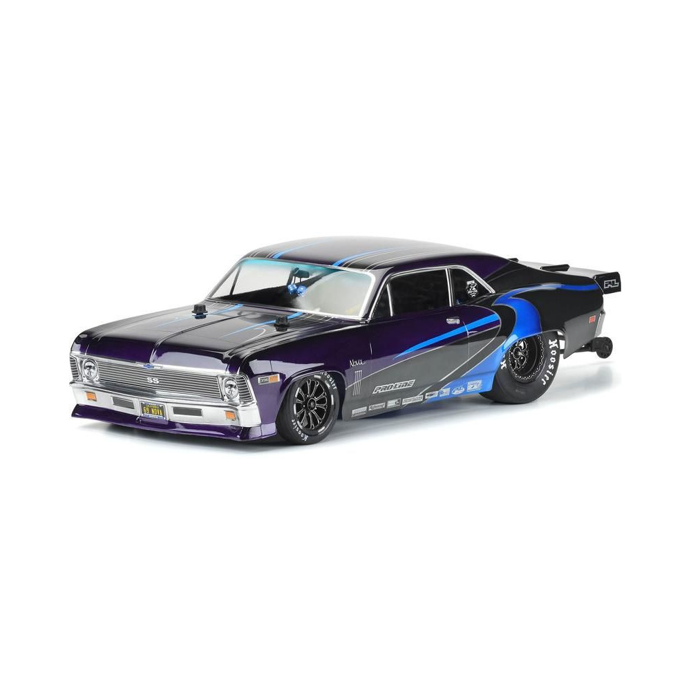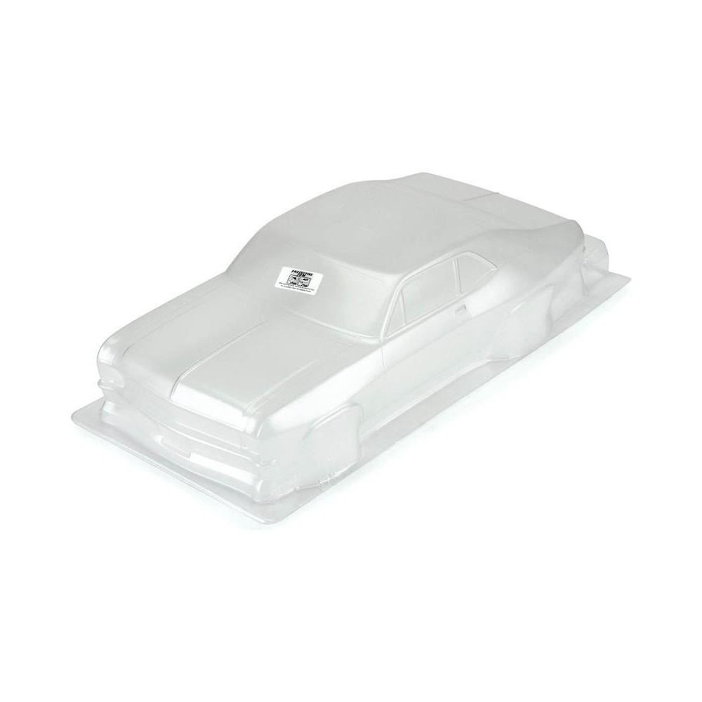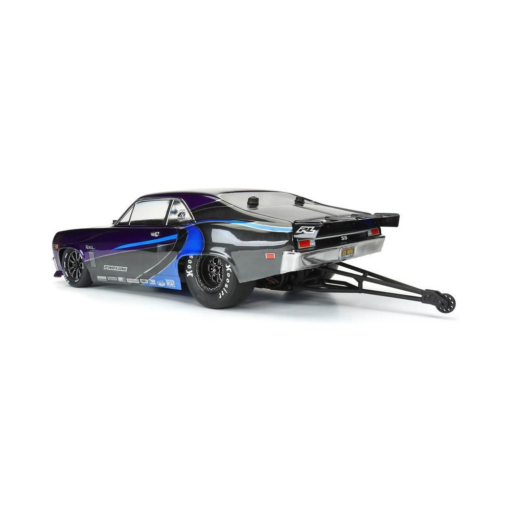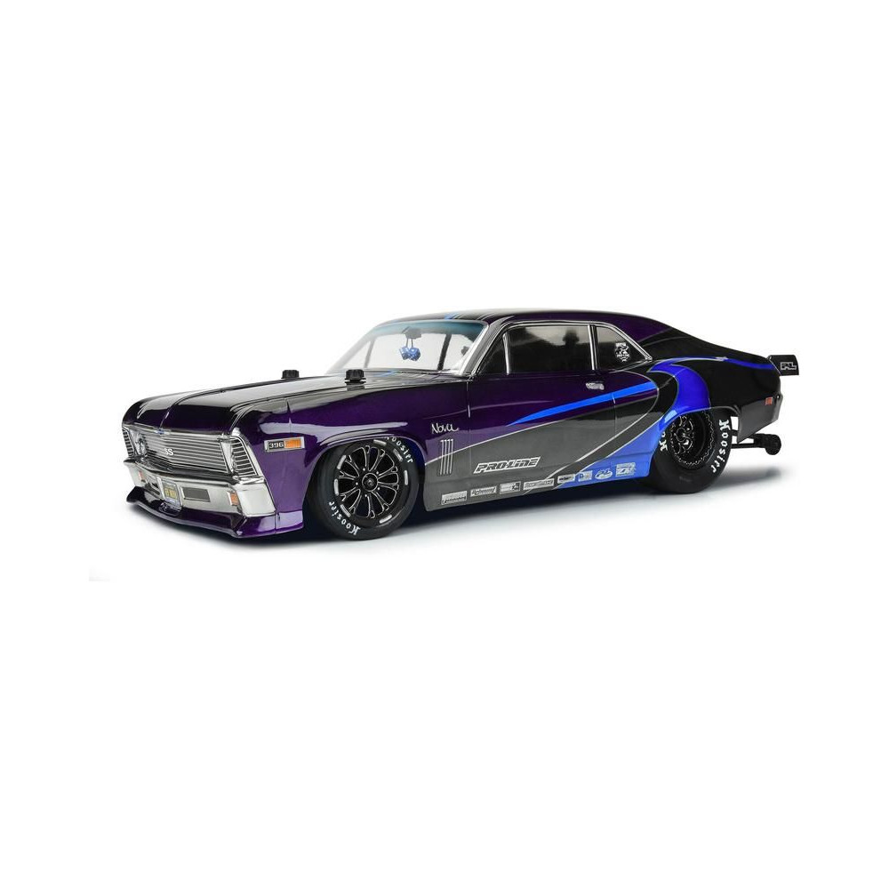 Pro-Line karosszéria tiszta 1969 Chevrolet Nova Drag Car, 1:10 méretarányú RC autó modellekhez, tengelytáv 335mm, hossz 561mm, magasság 147mm. Tartós lexánból készült.