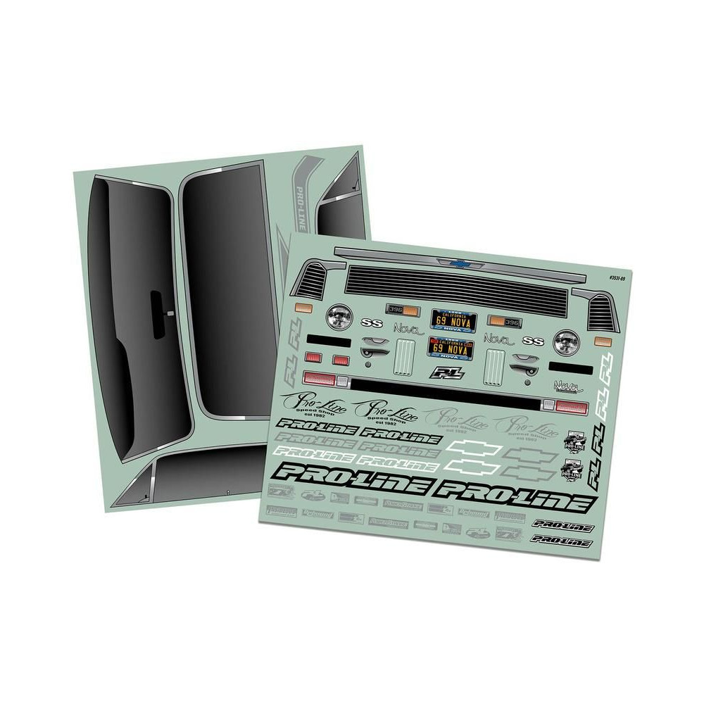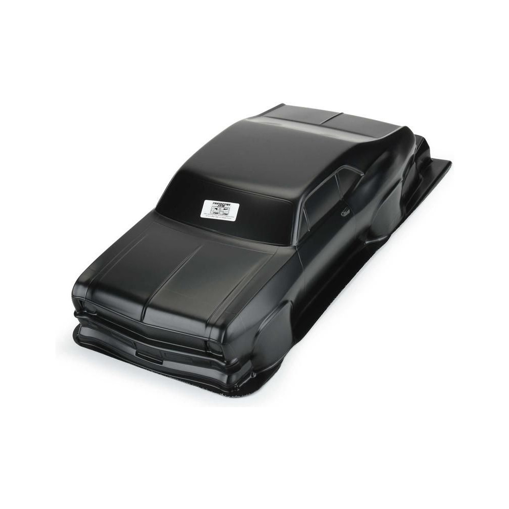 Pro-Line karosszéria fekete 1969 Chevrolet Nova Drag Car, 1:10 méretarányú RC autó modellekhez, tengelytáv 335mm, hossz 561mm, magasság 147mm. Tartós lexánból készült.