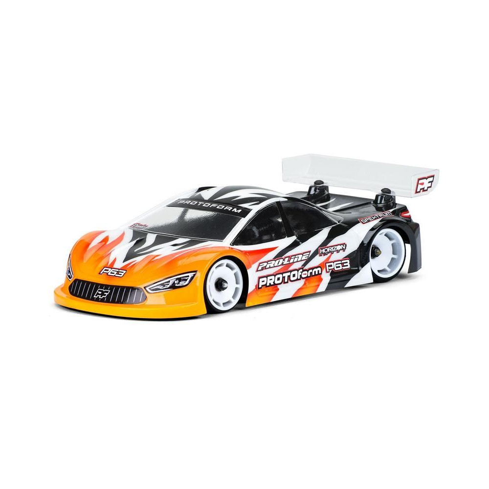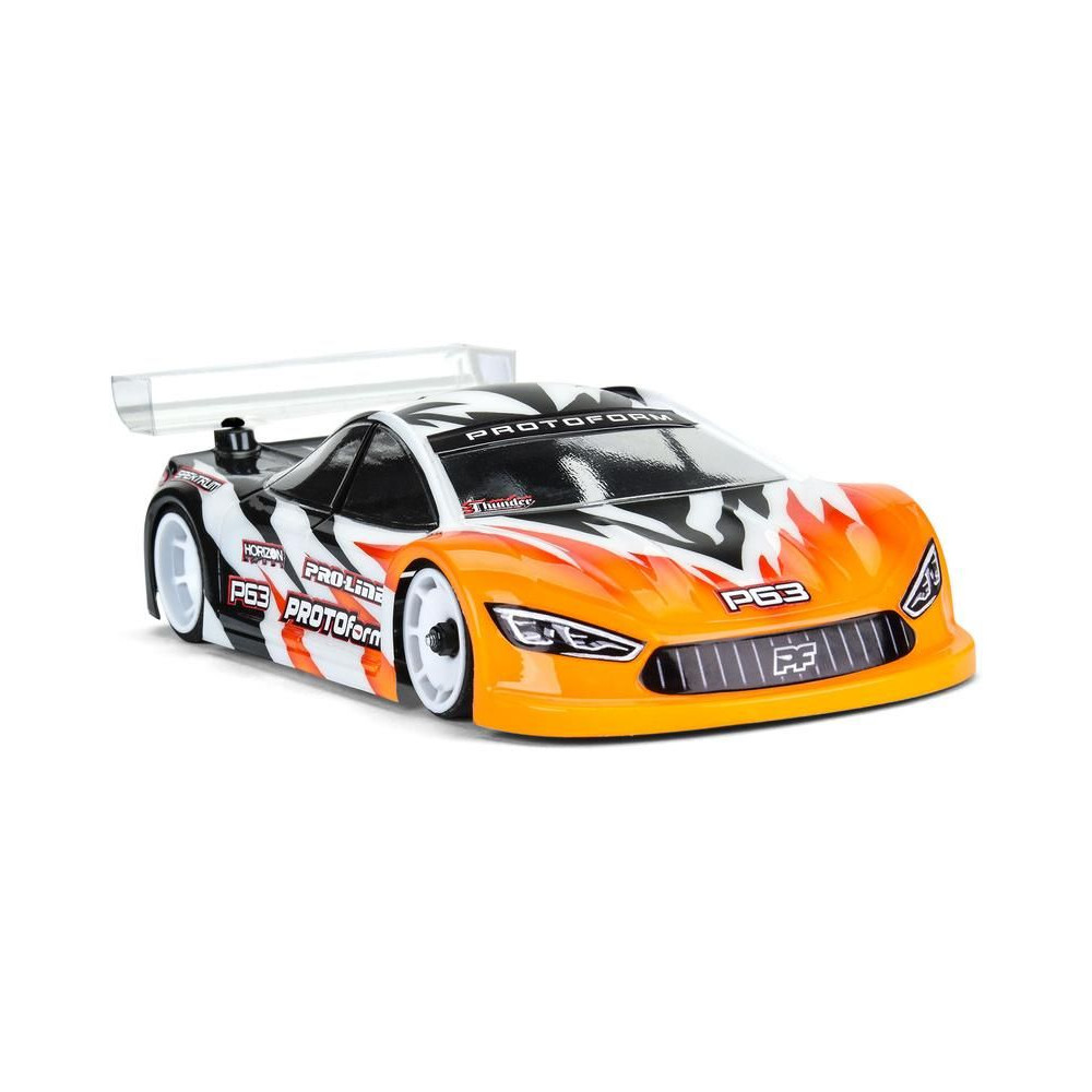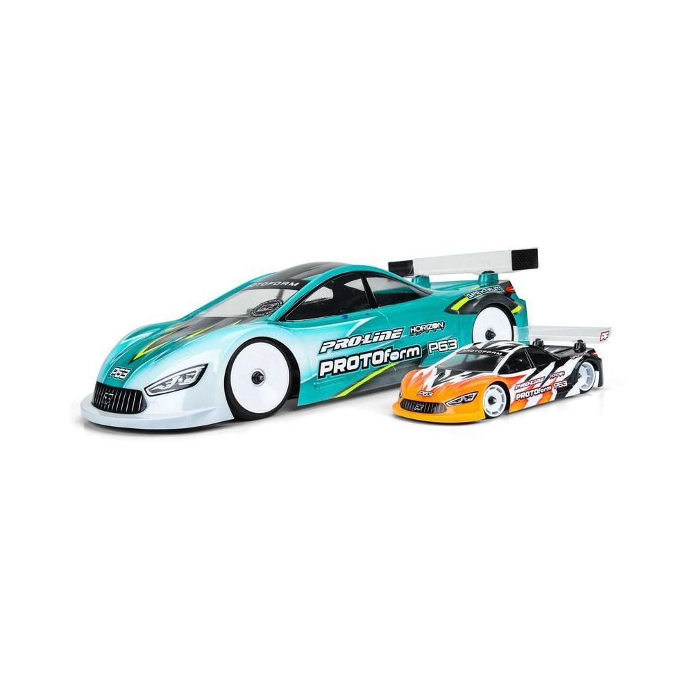 PROTOform karosszéria 1:28 P63 (98 mm tengelytáv): a Mini-Z a PROTOform legújabb aerodinamikai megoldása a rendkívül versenyképes elektromos túraautóversenyzéshez. Nagy leszorítóerőre tervezték, alacsony súlypont mellett. Tartós polikarbonátból készült átlátszó karosszéria.