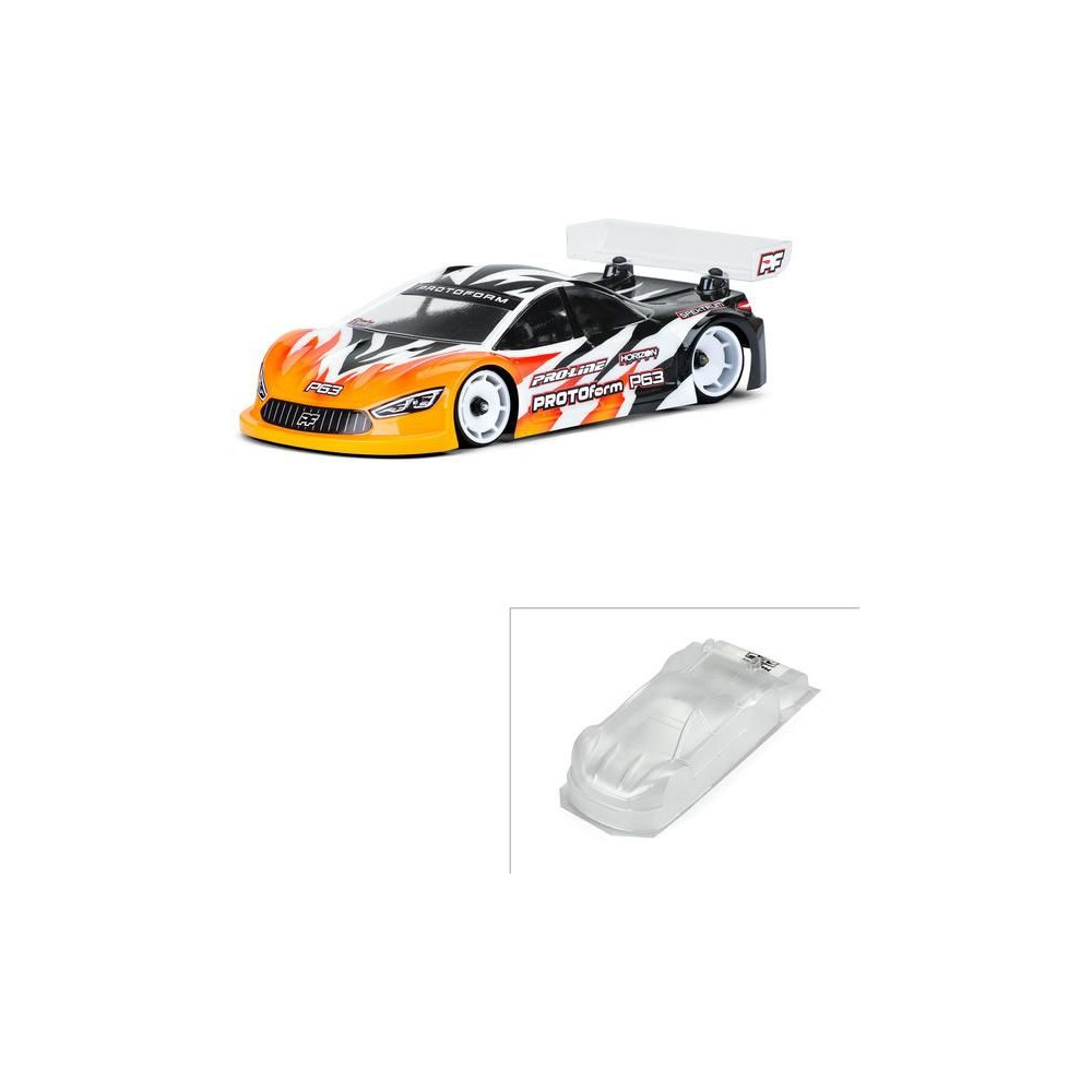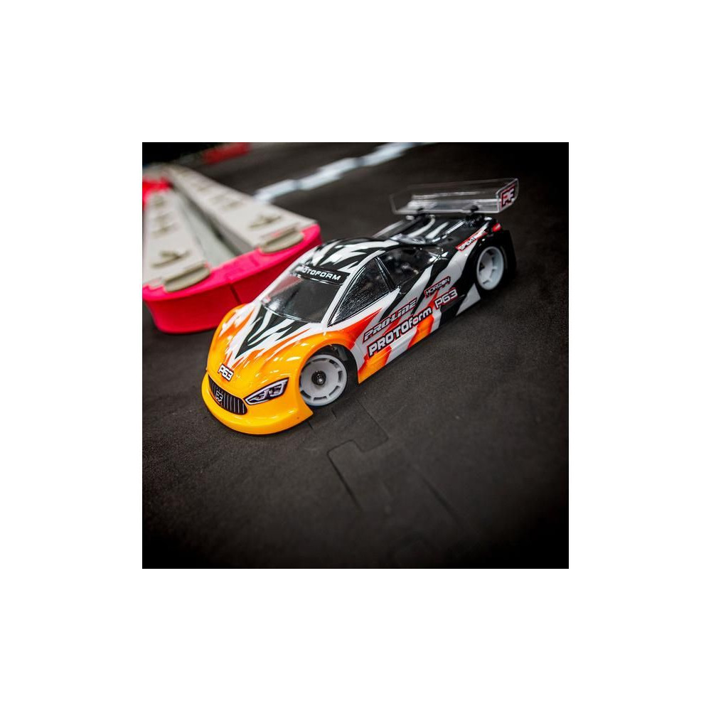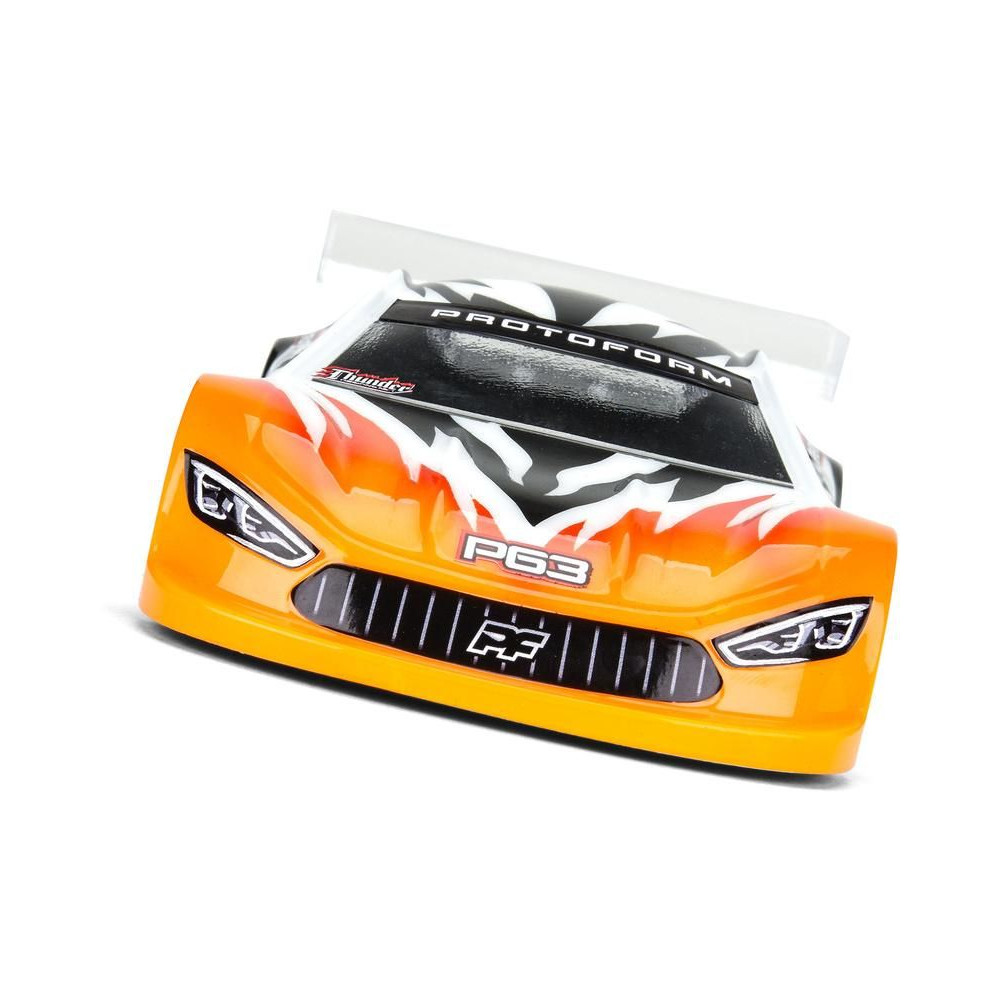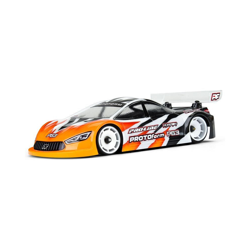 PROTOform karosszéria 1:28 P63 (98 mm tengelytáv): a Mini-Z a PROTOform legújabb aerodinamikai megoldása a rendkívül versenyképes elektromos túraautóversenyzéshez. Nagy leszorítóerőre tervezték, alacsony súlypont mellett. Tartós polikarbonátból készült átlátszó karosszéria.