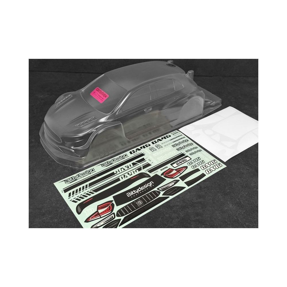 Az 1/10 méretarányú TC elsőkerék-meghajtású modellekhez való átlátszó karosszéria védőfóliával borítva, amely kiváló minőségű polikarbonátból készült, valamint a csomagban találhatók matricák is.
