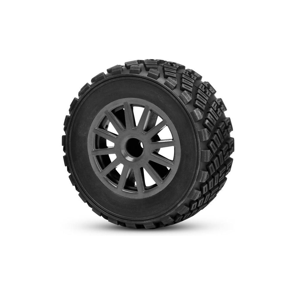 A tartós 12 küllős rally-stílusú kerekek 12 mm-es keréktárcsával és a Slash 4x4 modellekkel megegyező eltolással rendelkeznek. A gumiabroncsok egyedi, irányított futófelületi mintázatúak, nagy tapadással a kemény felületeken és azokon kívül is.