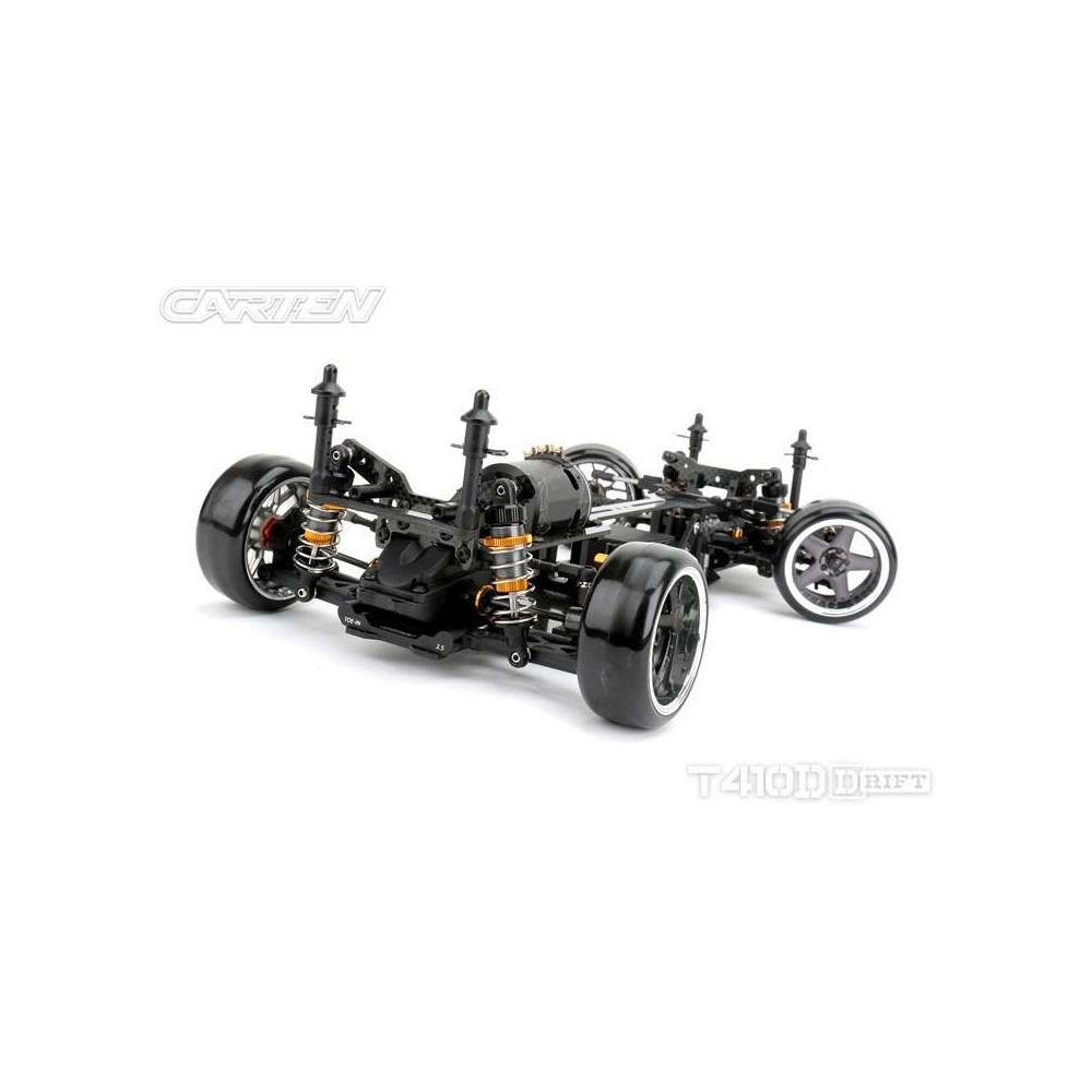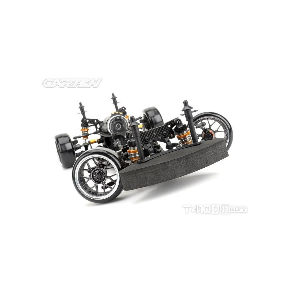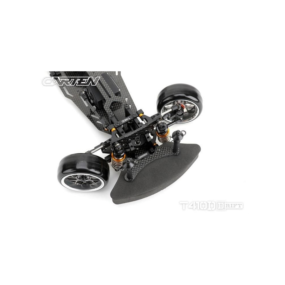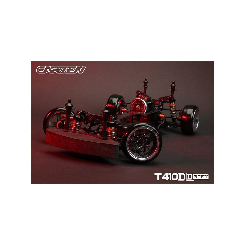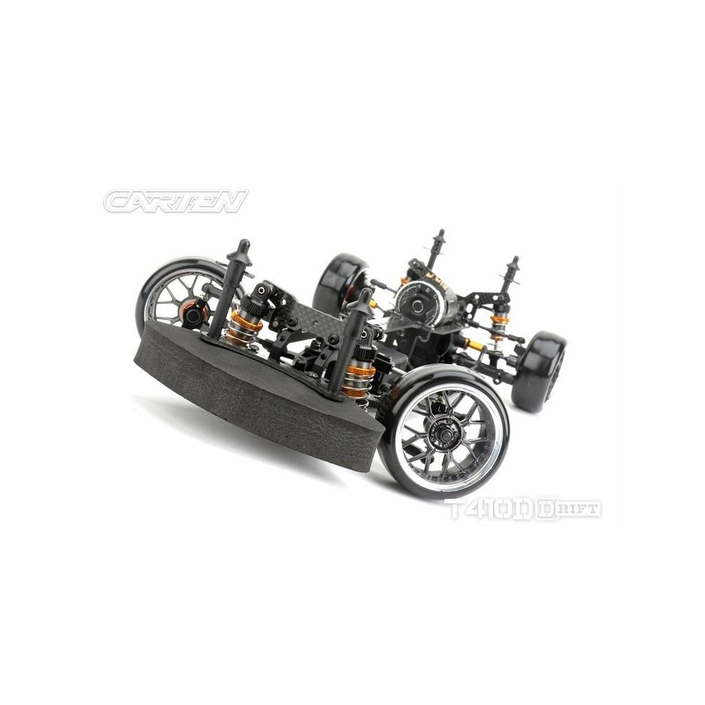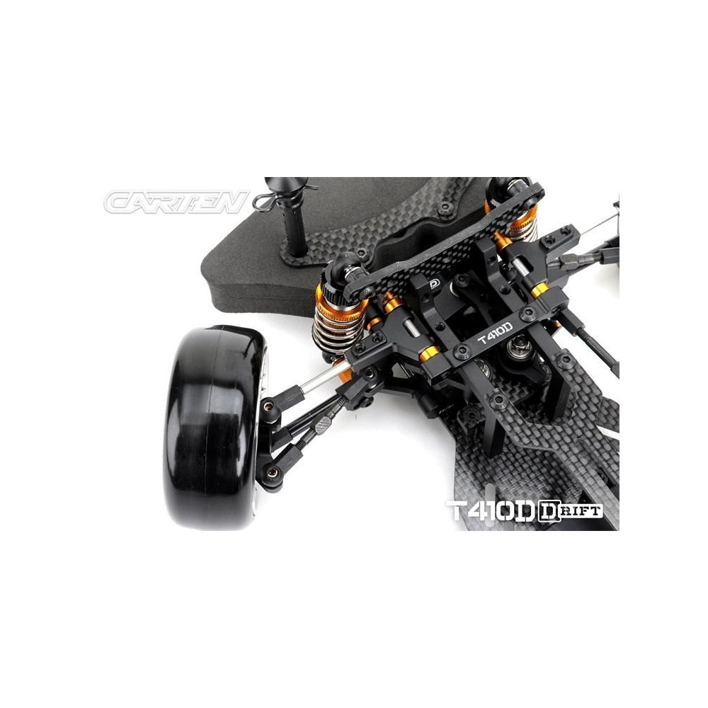Alvázkészlet hobbi és verseny 1/10-es RC drifthez. A Carten T410D minőségi karbon és alumínium alkatrészeket kínál. A modern elrendezés magában foglal egy hosszanti felső motortartót és egy akkumulátortartót a hátsó tengely közelében. Az eredmény egy optimális súlypont, és a hátsó tengely terhelése még versenyzésre is optimális. A magas maximális kormányszög és a geometriai beállítások széles választéka kielégíti az igényes sofőrök igényeit.
