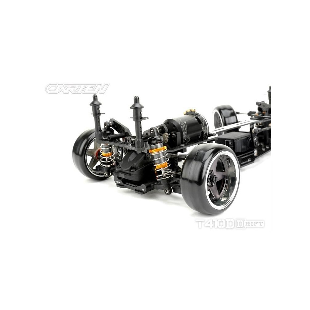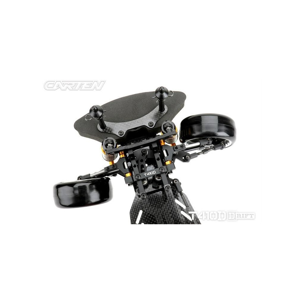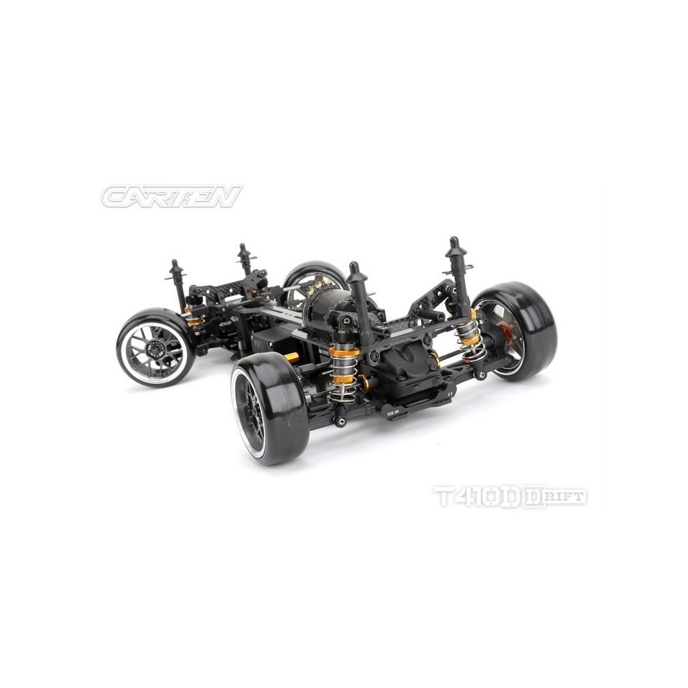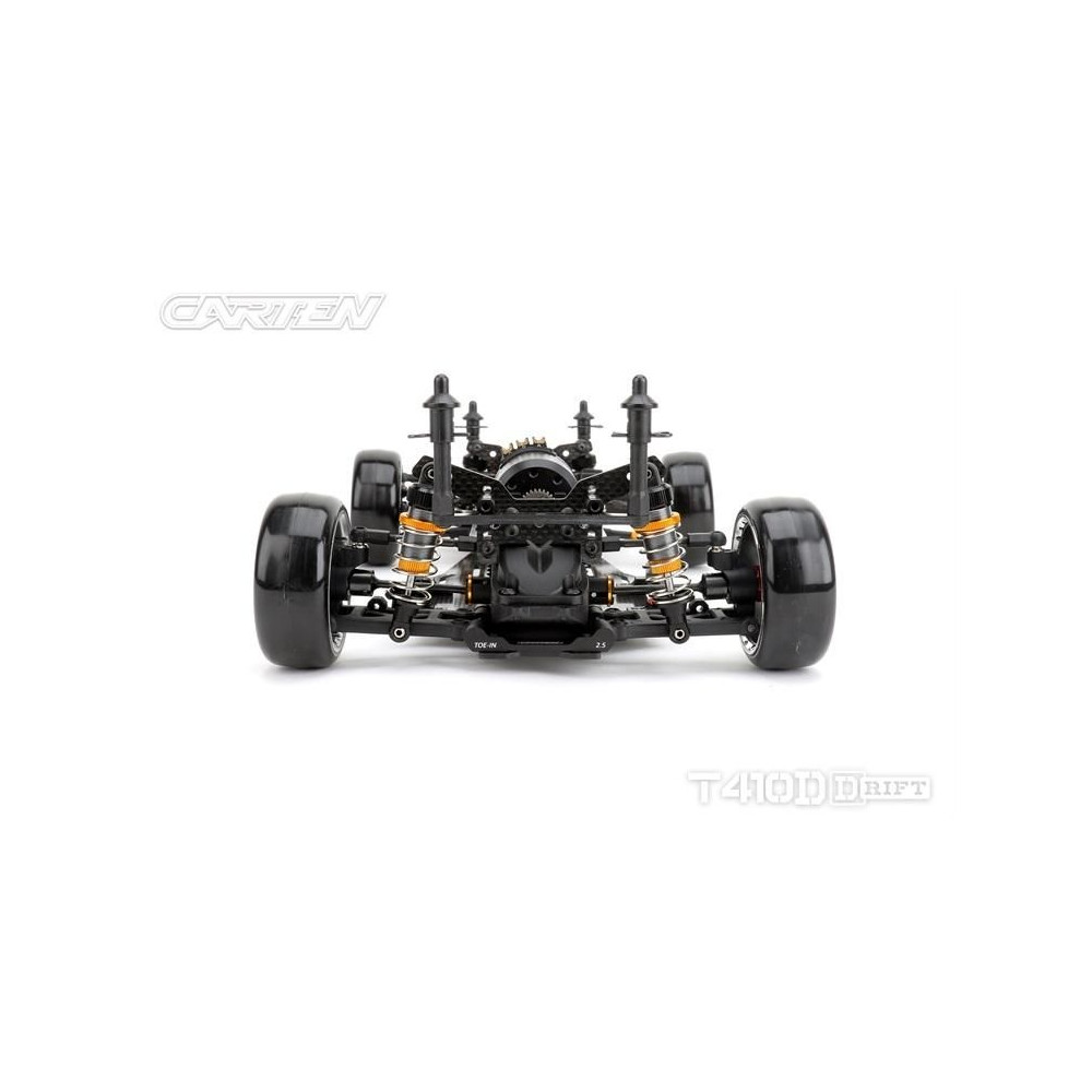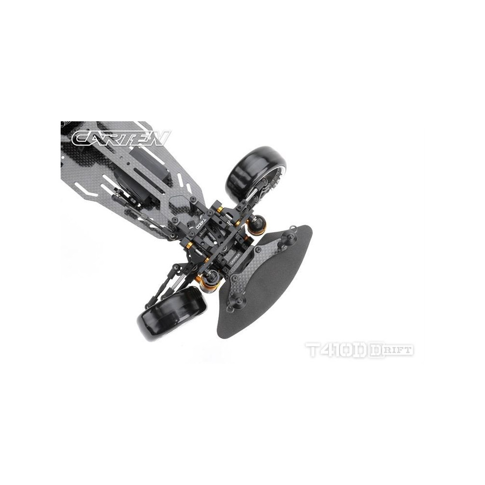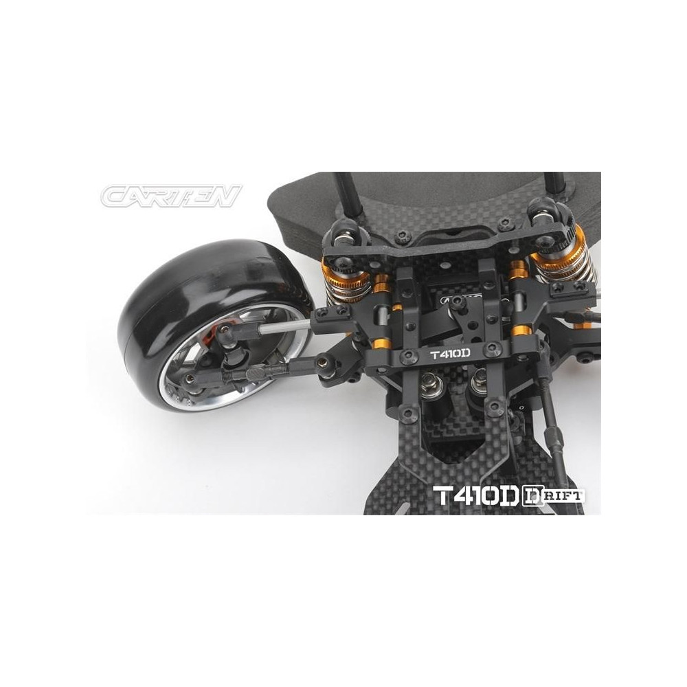 Alvázkészlet hobbi és verseny 1/10-es RC drifthez. A Carten T410D minőségi karbon és alumínium alkatrészeket kínál. A modern elrendezés magában foglal egy hosszanti felső motortartót és egy akkumulátortartót a hátsó tengely közelében. Az eredmény egy optimális súlypont, és a hátsó tengely terhelése még versenyzésre is optimális. A magas maximális kormányszög és a geometriai beállítások széles választéka kielégíti az igényes sofőrök igényeit.