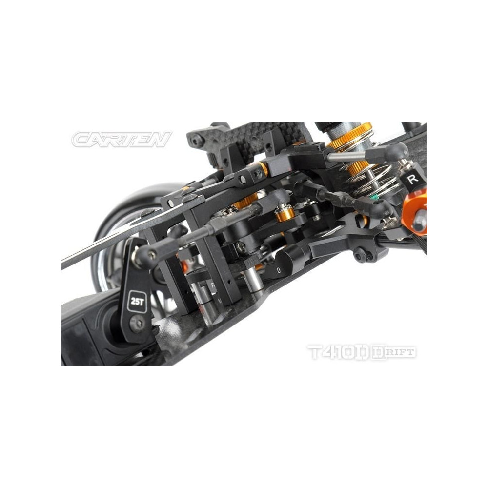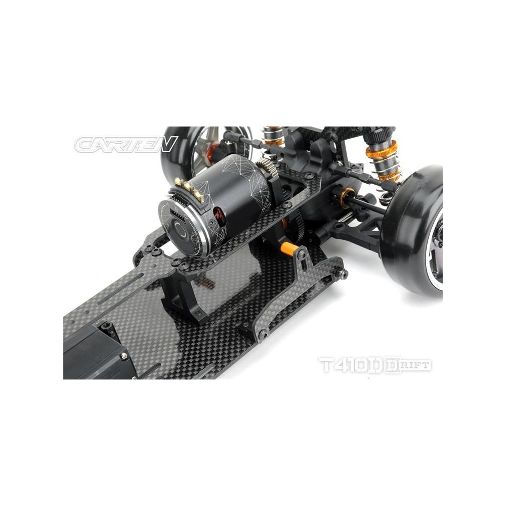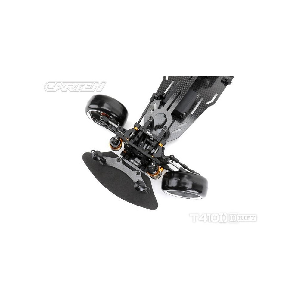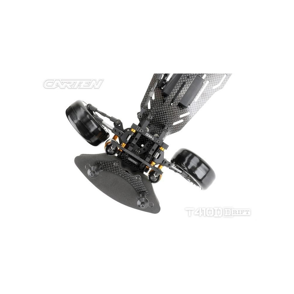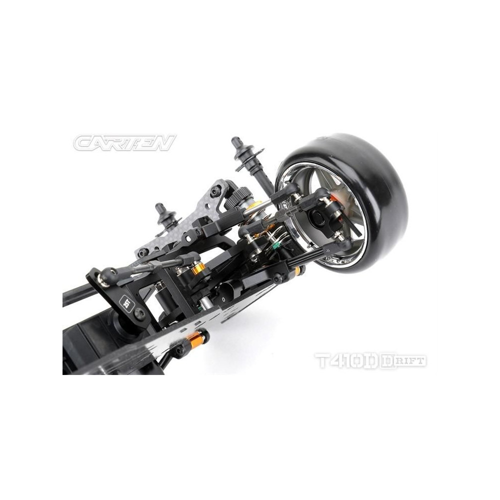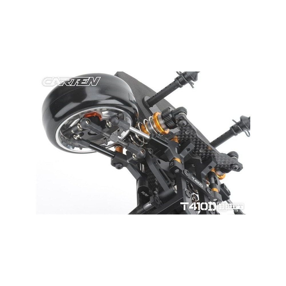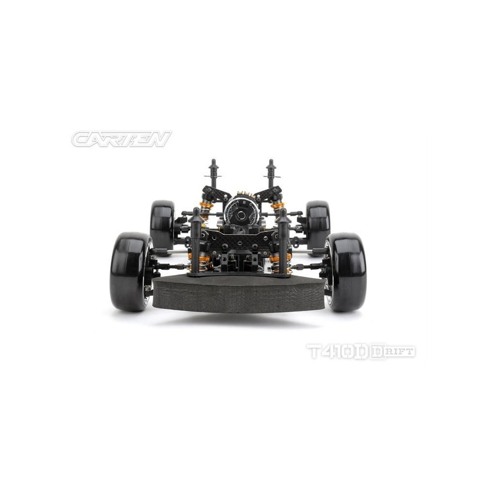 Alvázkészlet hobbi és verseny 1/10-es RC drifthez. A Carten T410D minőségi karbon és alumínium alkatrészeket kínál. A modern elrendezés magában foglal egy hosszanti felső motortartót és egy akkumulátortartót a hátsó tengely közelében. Az eredmény egy optimális súlypont, és a hátsó tengely terhelése még versenyzésre is optimális. A magas maximális kormányszög és a geometriai beállítások széles választéka kielégíti az igényes sofőrök igényeit.