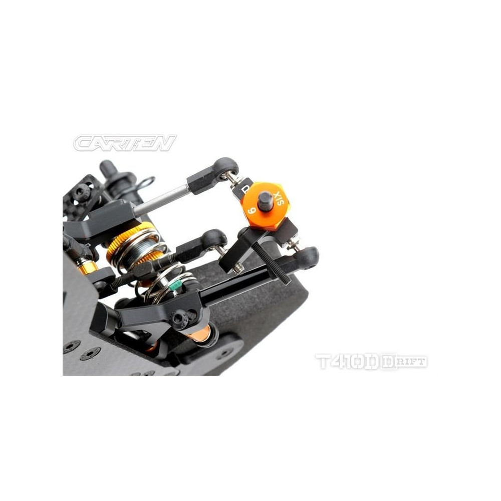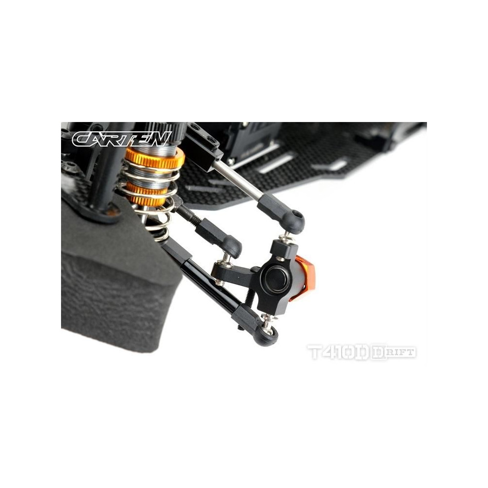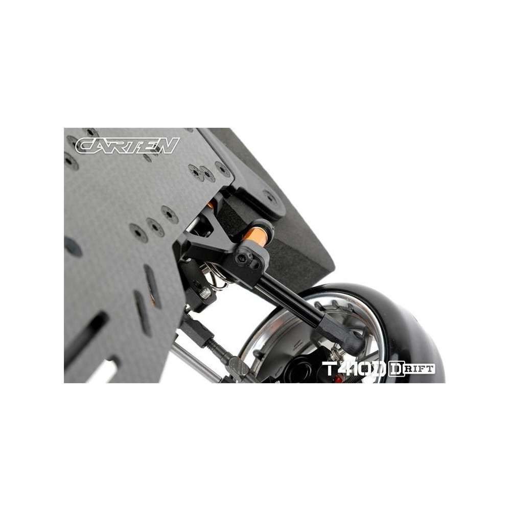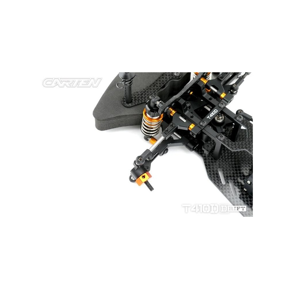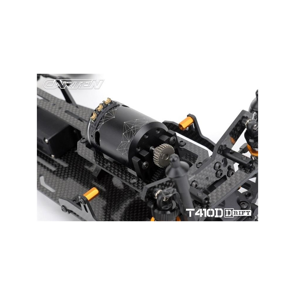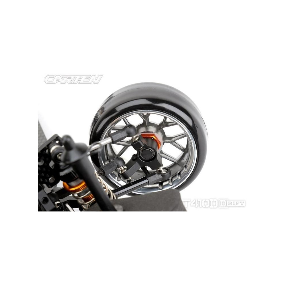 Alvázkészlet hobbi és verseny 1/10-es RC drifthez. A Carten T410D minőségi karbon és alumínium alkatrészeket kínál. A modern elrendezés magában foglal egy hosszanti felső motortartót és egy akkumulátortartót a hátsó tengely közelében. Az eredmény egy optimális súlypont, és a hátsó tengely terhelése még versenyzésre is optimális. A magas maximális kormányszög és a geometriai beállítások széles választéka kielégíti az igényes sofőrök igényeit.
