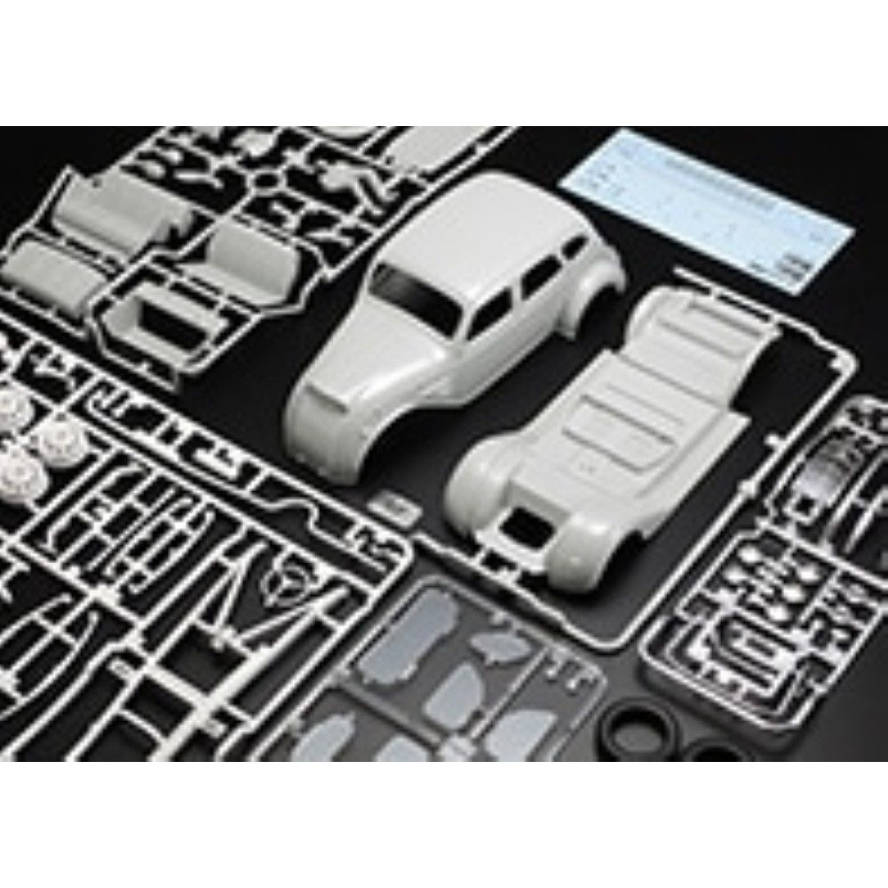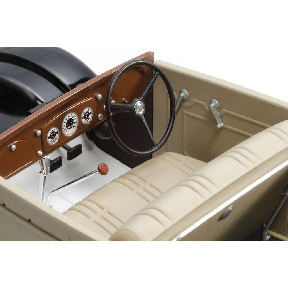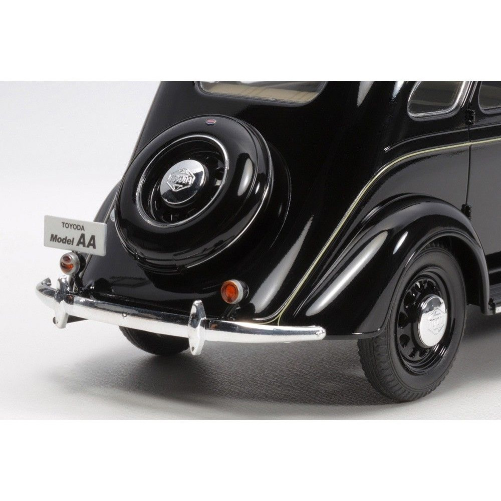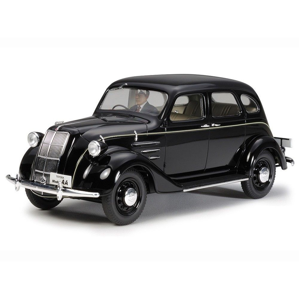 A Toyoda AA modell részletesen kidolgozott műanyag modellje 1:24 méretarányban, valósághű belső térrel, alvázzal, fémbevonatú alkatrészekkel és vezetőfigurával.