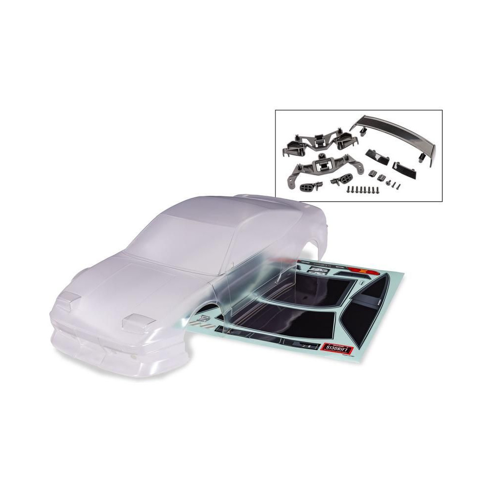 Nissan 240SX Traxxas karosszériák, átlátszó. Kivágott, festést és felületkezelést igényel. Modell kiegészítőkkel és rögzítőelemekkel együtt.
