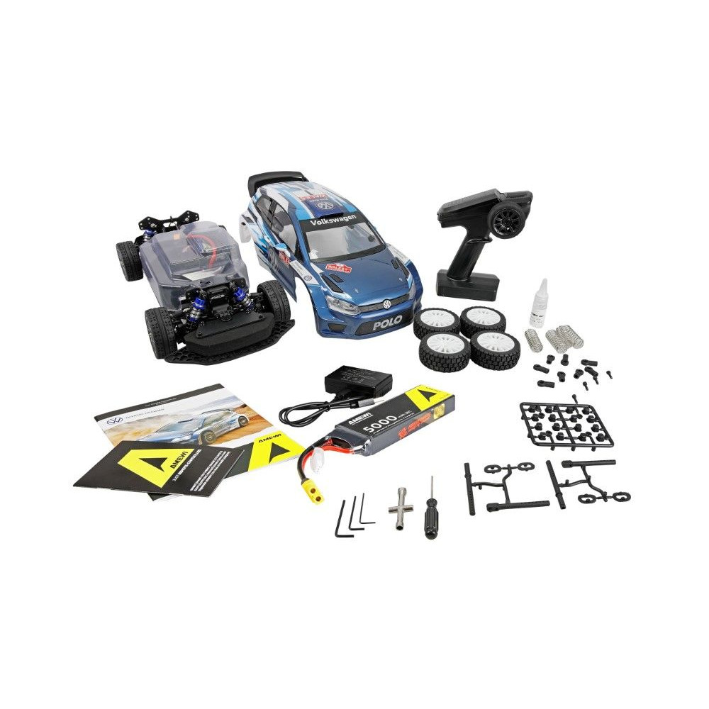 ![]() A nagy kapacitású 2S 5000mAh LiPo akkumulátor hosszú vezetési időt és elegendő energiát biztosít akár 47 km/h sebesség eléréséhez. | ![]() Hivatalosan engedélyezett Volkswagen Polo R WRC karosszéria integrált LED lámpákkal és modelladatokkal. |