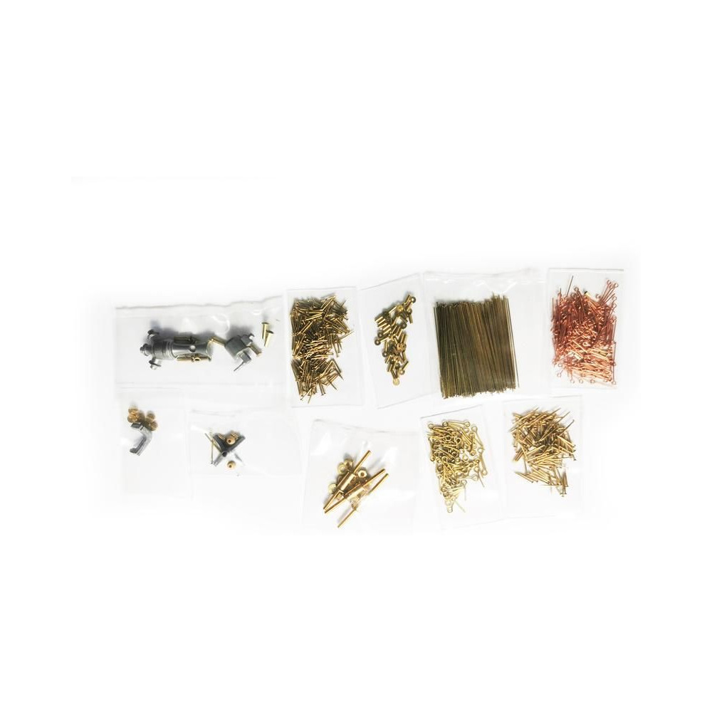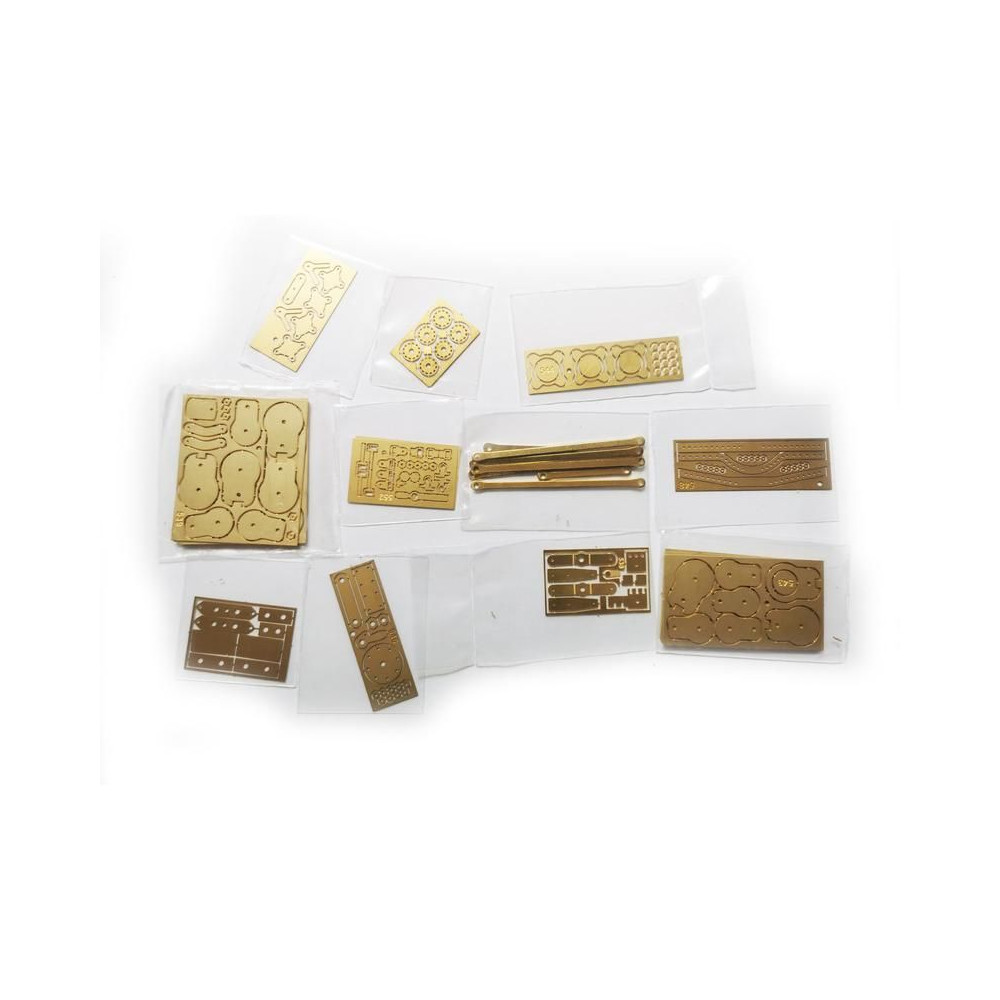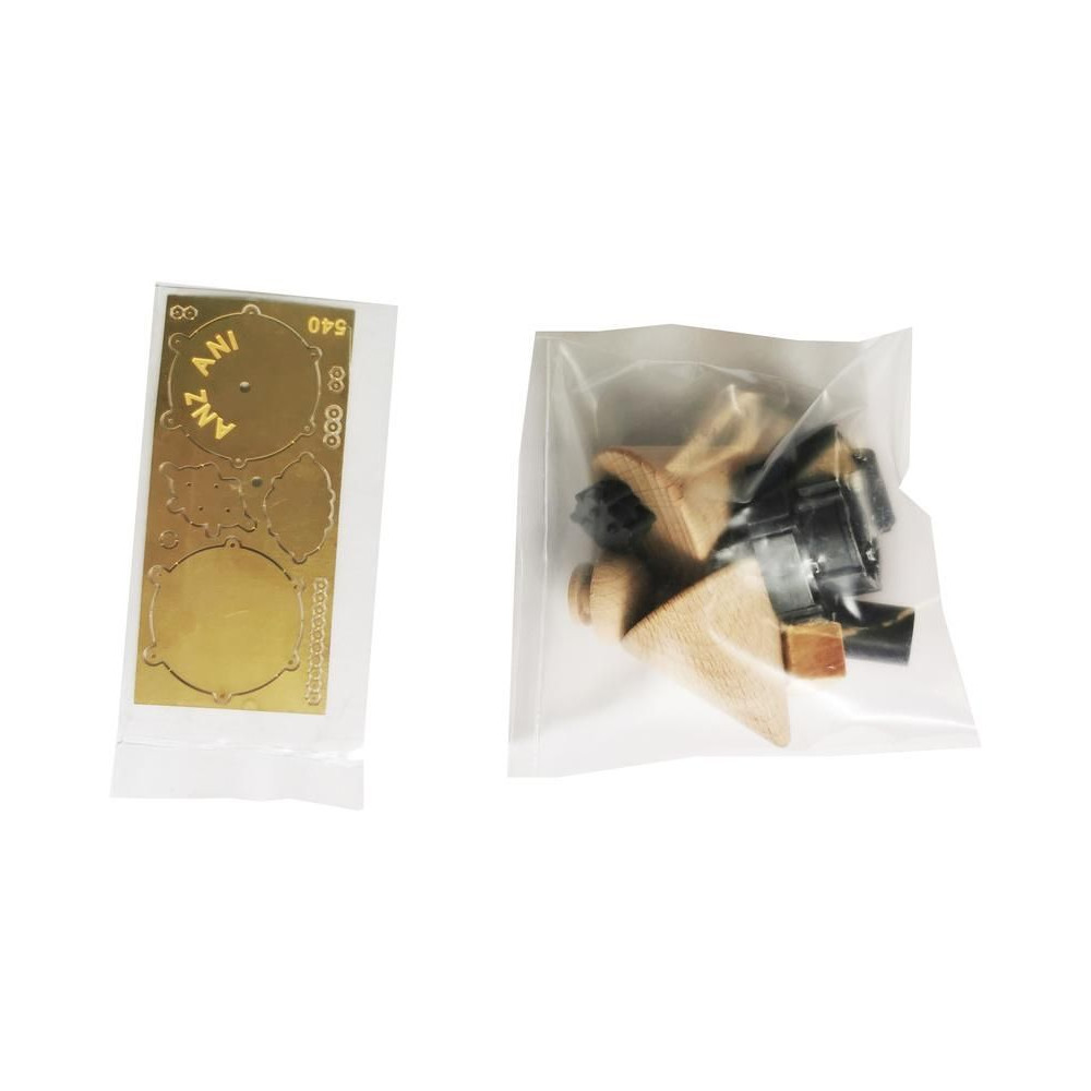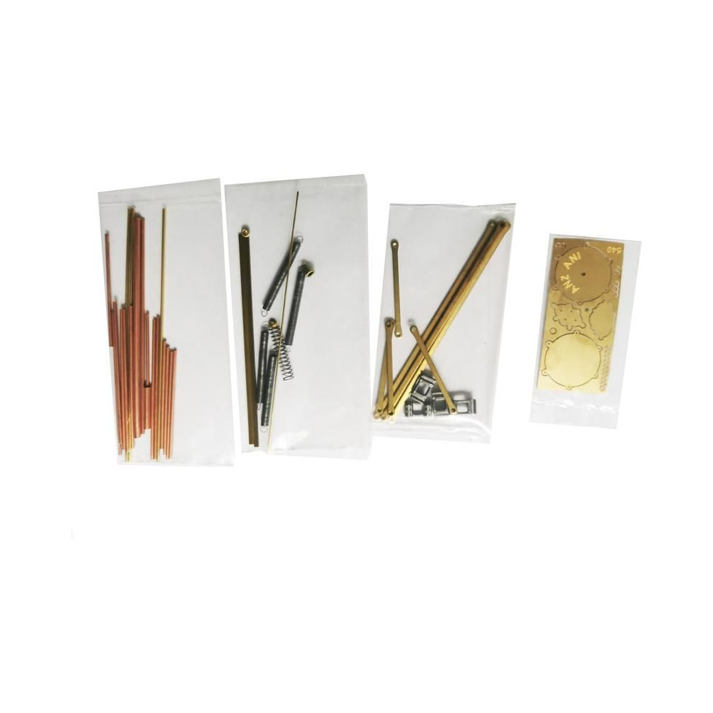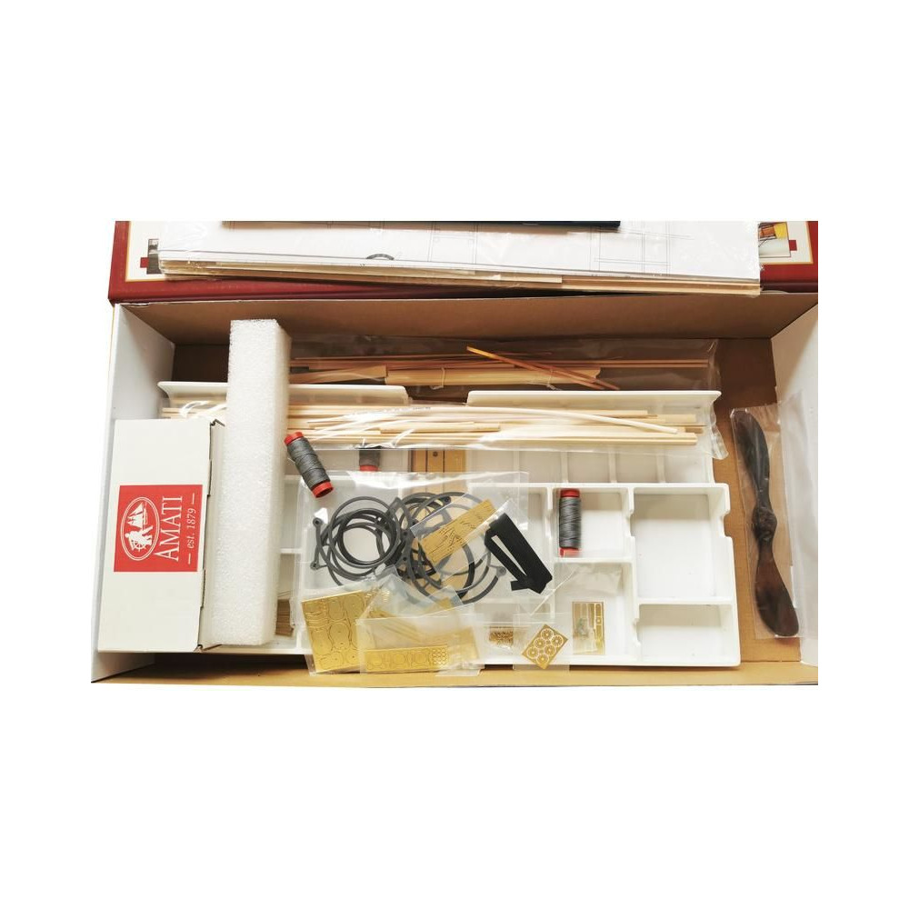 A doboz fedelét kinyitva a modell fából készült rétegelt lemezből készült alkatrészeit, egy sor öntvényt, apró alkatrészeket, egy rajzkészletet és egy kézikönyvet talál.