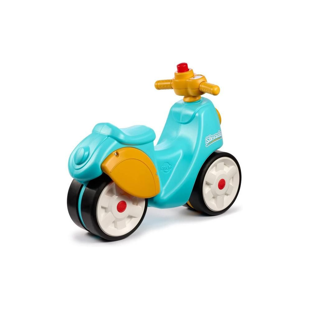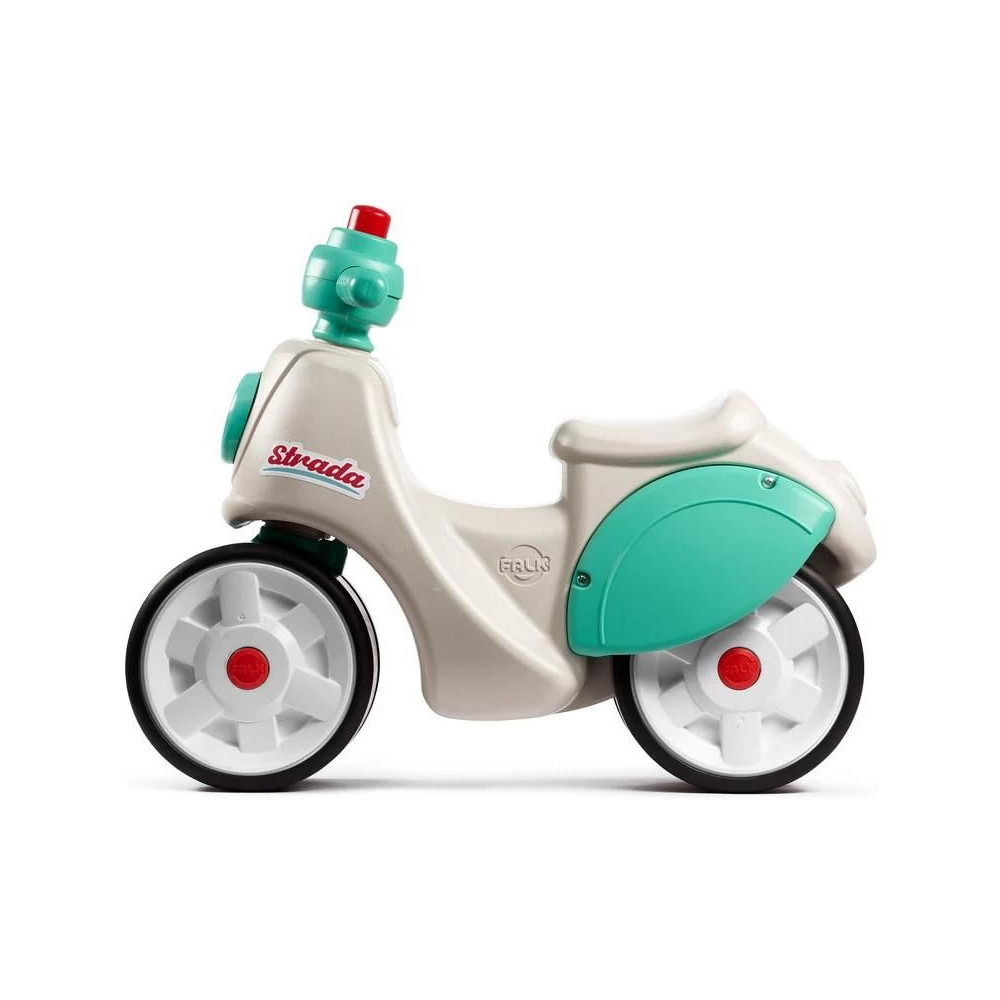 FALK Strada gyermekrobogó - stílusos retro robogó formájában. Kiváló minőségű, tartós műanyagból készült, a gyermekek biztonságát szem előtt tartva. Az elasztomer bevonatnak köszönhetően a roller ellenállóbb a karcolásokkal szemben. Széles kerekek a stabilitás érdekében. Kürt a kormányon. Gyermekeknek 1 és 3 éves kor között.