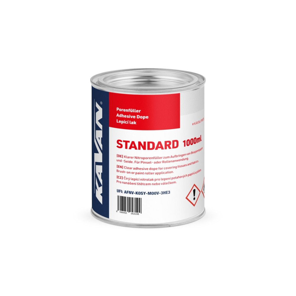 Használat: Rendszerint hígítatlanul alkalmazza (szükség esetén használja a KAVAN Hígító STANDARD-ot); puha lapos ecsettel, vagy hengerrel vigye fel a vázra. Azonnal nyomja és nyomja le a fedőpapírt vagy vásznat; a légbuborékokat ecsettel vagy hengerrel távolítsa el. Hagyja száradni legalább 24 órán át, majd csiszolja le 600-1000 szemcsés finom csiszolópapírral. Belső égésű motorral rendelkező modellnél üzemanyagálló fedőlakkot kell alkalmazni (pl. KAV56.9990 KAVAN fedőlakk POLY, 5MA4401 RC Color tiszta sprayfesték).