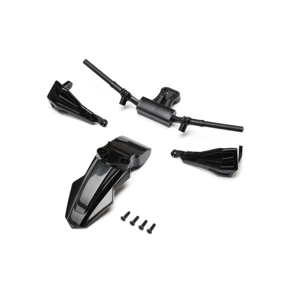 Alkatrész a Losi 1:4 Moto SM motorkerékpár RC modelljéhez: sárvédő, kézvédők, kormány, fekete színben.