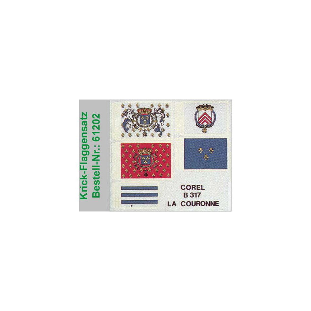 Modell tartozékok Krick hajómodellekhez: La Couronne zászlókészlet. Zászló piros/arany/kék 54 x 40 mm, zászló angyal fehér/vörös/arany 54 x 40 mm, zászló kék/fehér csíkos 40 x 28 mm, zászló kék/arany 48 x 35 mm, zászló fehér/kék/vörös/arany 48 x 35 mm.