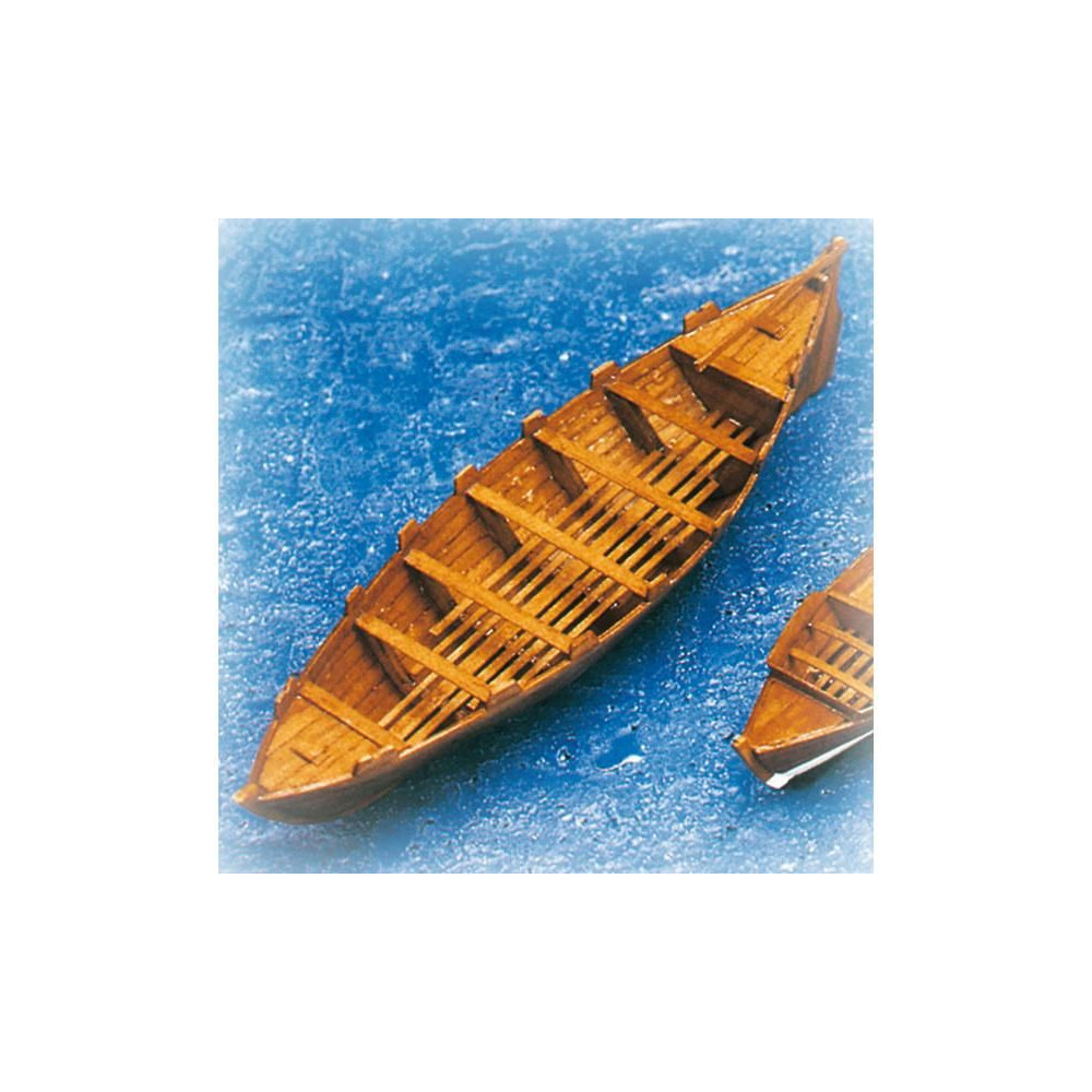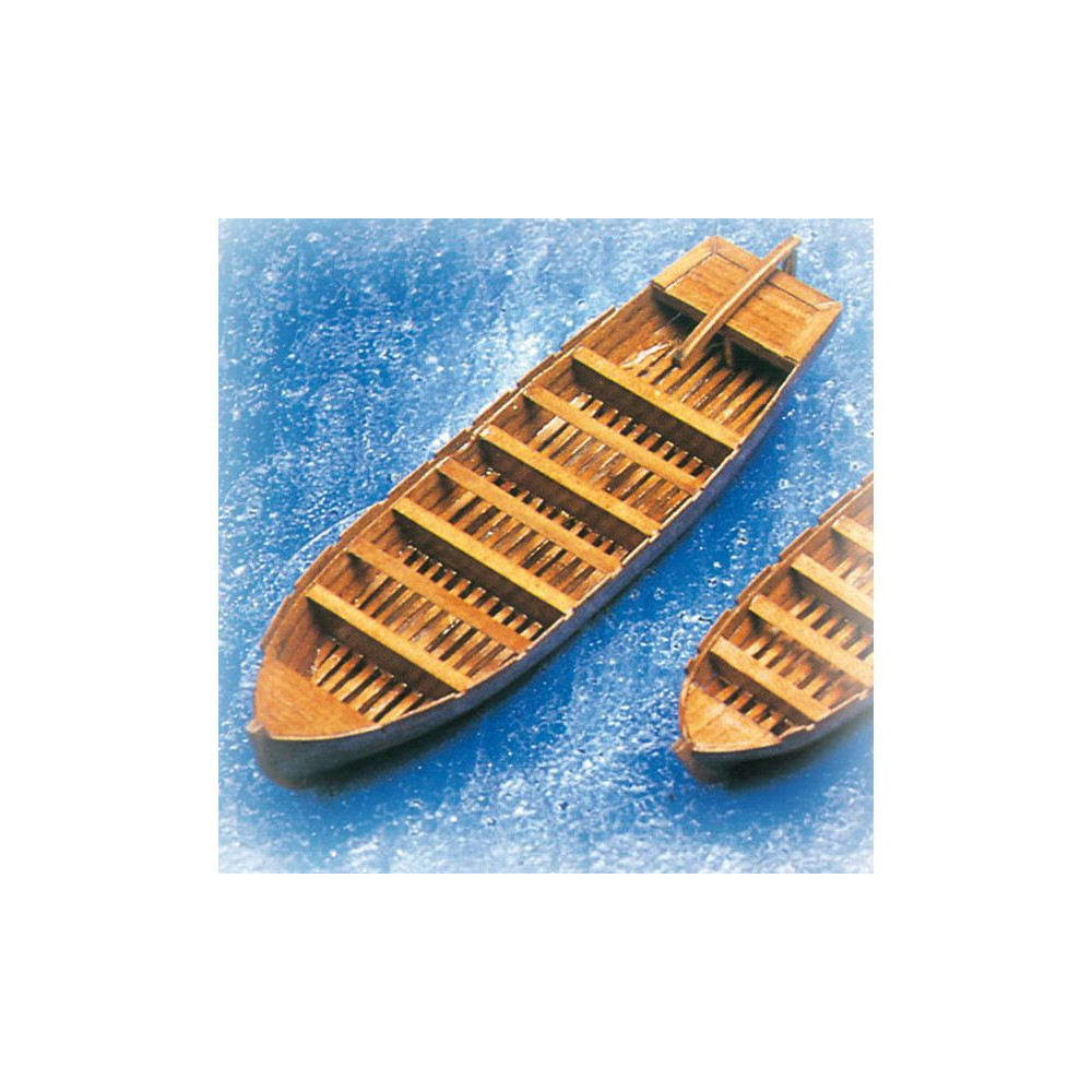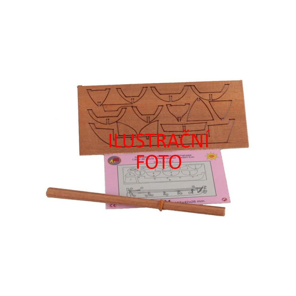 Krick: Horgászcsónak készlet, méretek 133x40x26mm. Az egyszerű készlet lézervágott rétegelt lemez válaszfalakat, korlátkészletet és építési terveket tartalmaz.