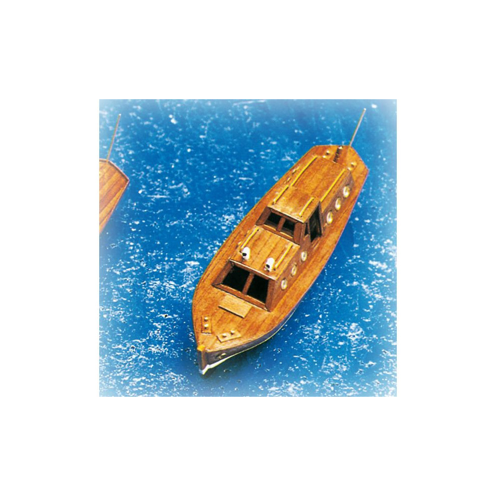 Fa hajómodell készlet - Motoros kabinos hajó, méretek 125x35x43mm. Az egyszerű készlet lézervágott rétegelt lemez válaszfalakat, korlátkészletet és építési terveket tartalmaz.