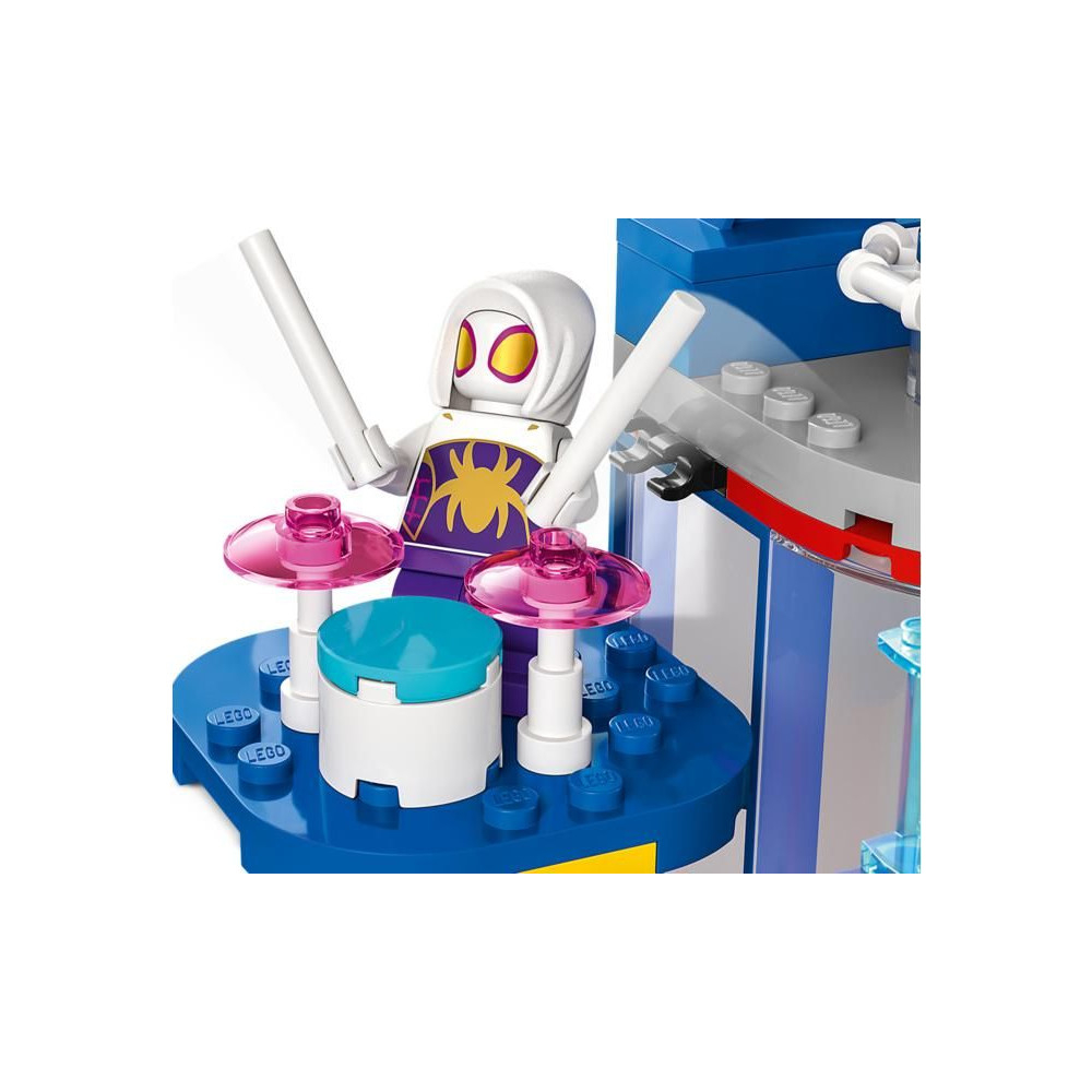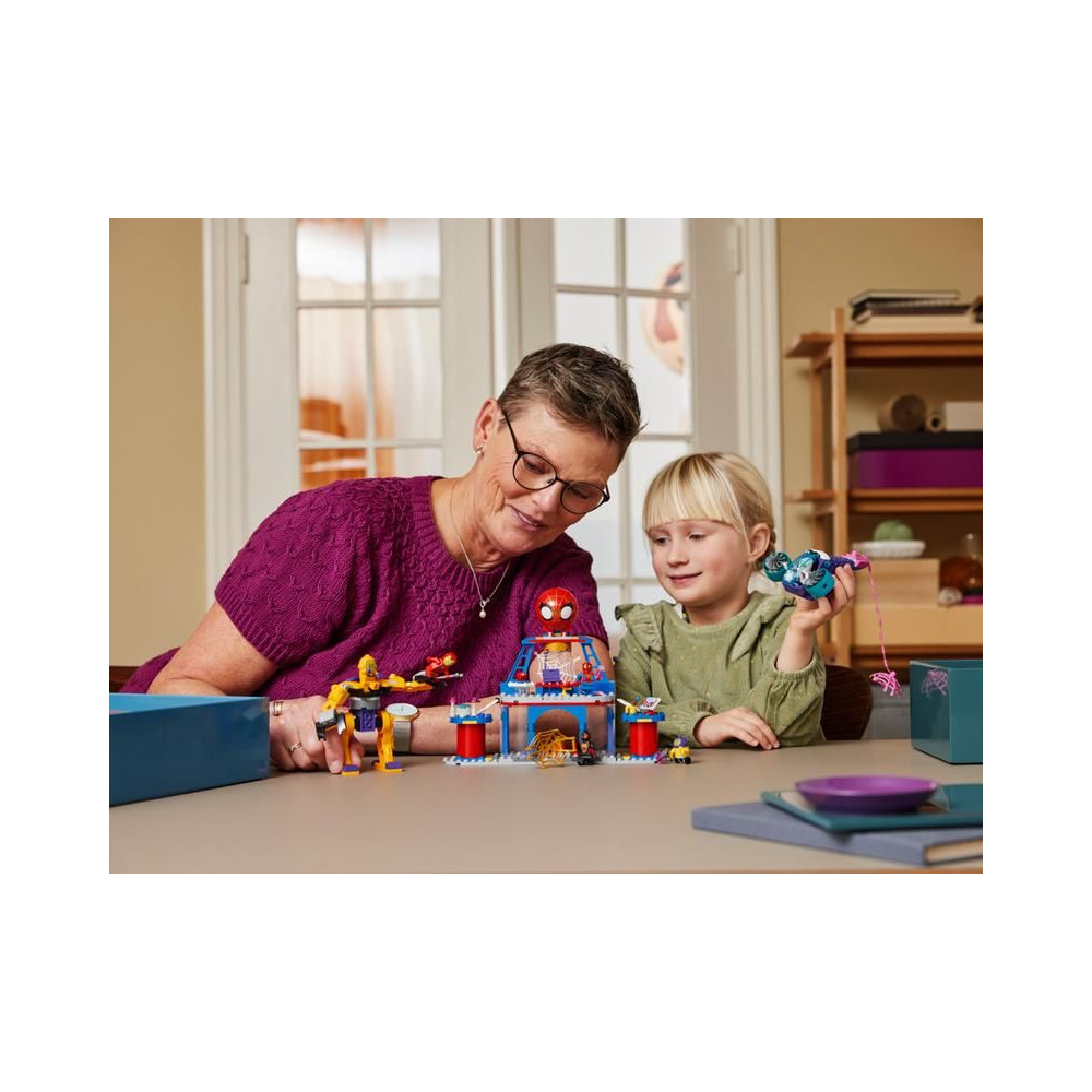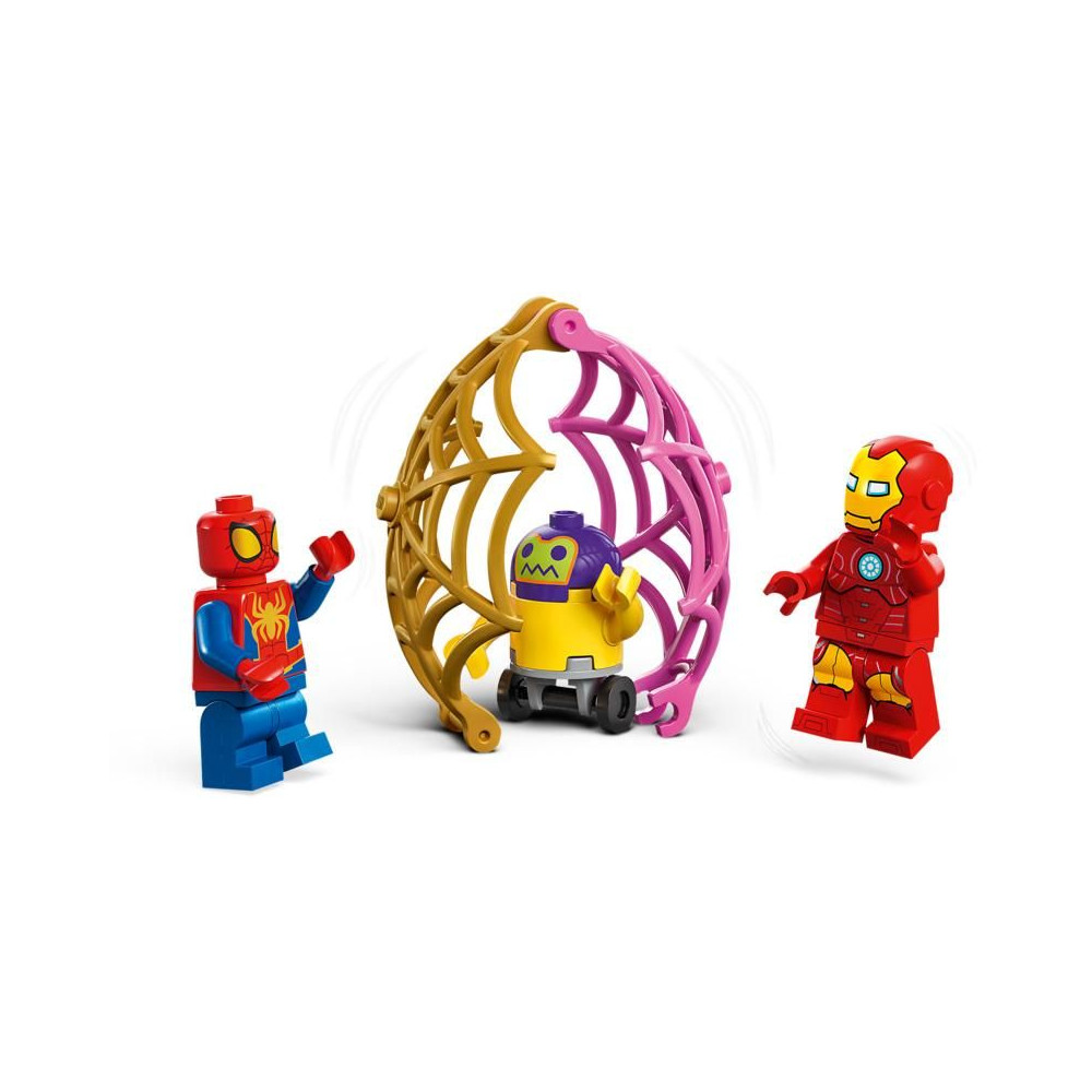 Ez a LEGO Marvel készlet Pók, Vasember, Miles "Spin" Morales, Szellem-Pók és Zola minifiguráit tartalmazza. Van továbbá Zola nagyméretű robotruhája mozgatható lábakkal és karmokkal, amelyekkel megragadhatod a minifigurát, egy siklórepülő rotorokkal és forgó propellerekkel, egy kinyitható pilótafülkével és egy nagy rózsaszín pókhálóval. A főépületben olyan inspiráló elemeket találsz, amelyek a szuperhősök érdeklődési körét mutatják meg: tudomány, zene és festészet.
