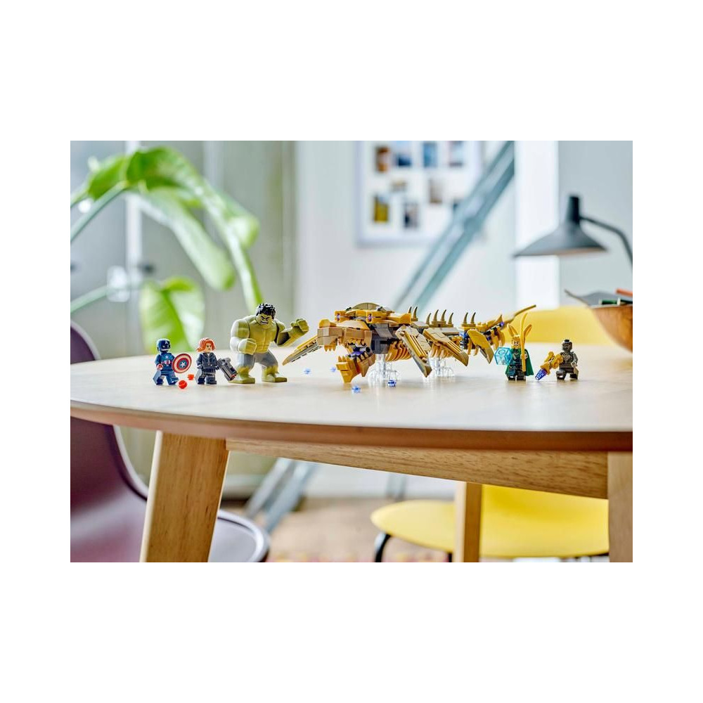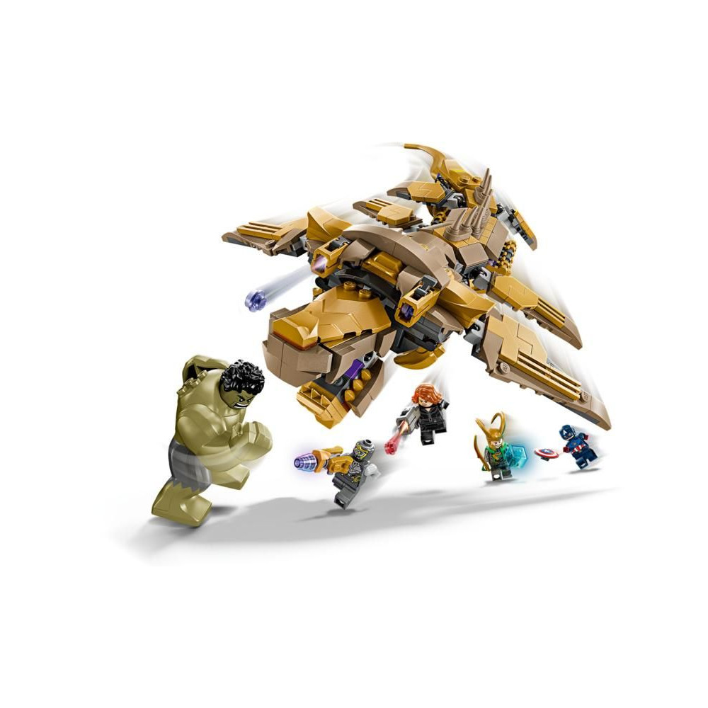 A készlet 4 minifigurát tartalmaz - Amerika kapitány pajzzsal, Fekete özvegy mesterlövészpuskával, Loki köpennyel és sisakkal, valamint Chitauri a harcos lézerpisztollyal -, valamint egy nagyméretű Hulk figurát. Az építhető Leviatán 6 mozgatható uszonyával, nyitható szájjal, enyhén oldalra fordítható fejjel és 2 kilövővel rendelkezik. A Leviathan átlátszó állványokkal érkezik, amelyek lehetővé teszik, hogy a minifigurák játék közben "repüljenek". Ezek még lenyűgözőbbé teszik a megjelenítést. Az intuitív LEGO Builder alkalmazással a gyerekek ráközelíthetnek a modellekre, elforgathatják őket 3D-ben, elmenthetik a készleteket és nyomon követhetik az építés előrehaladását.