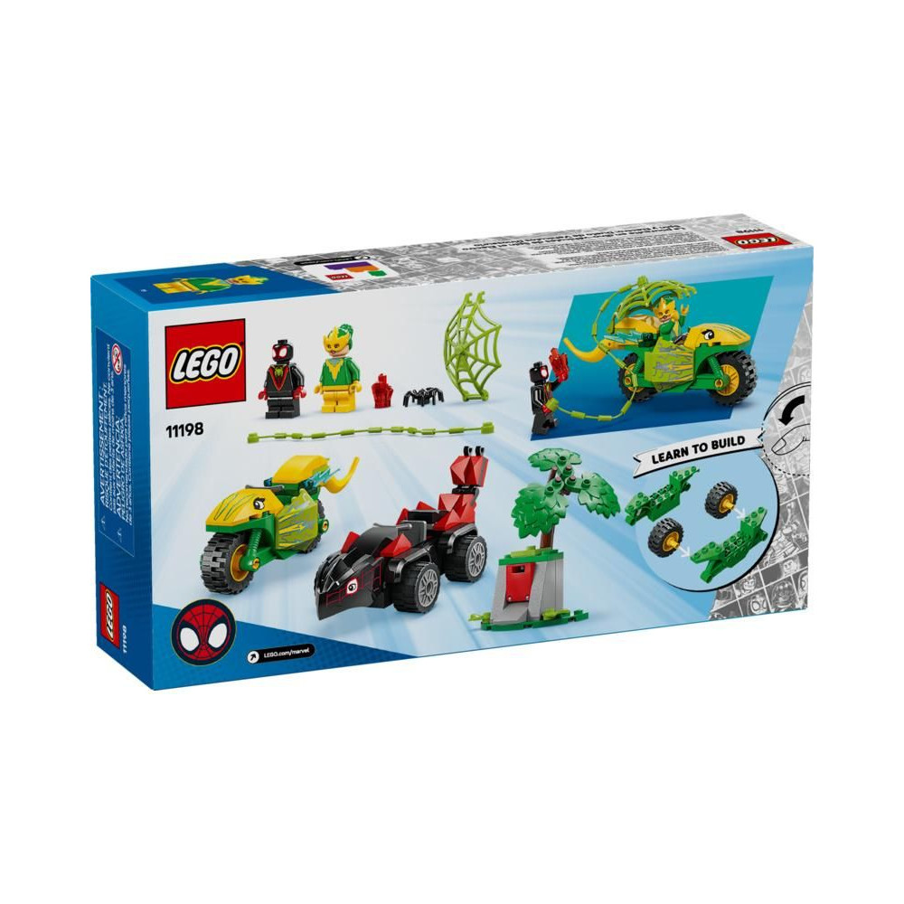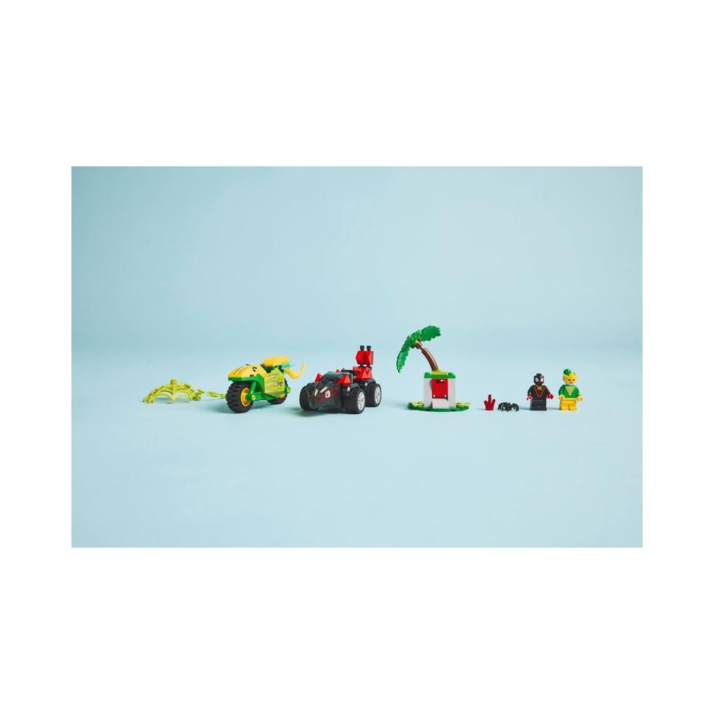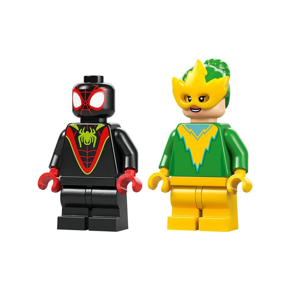 A készlet a Pókember és csodálatos barátai című tévésorozat "Dino-Webs" sorozatának akciójeleneteit ábrázolja. A csomag 2 szuperhős minifigurát és 2 vontatható dinoszaurusz járművet tartalmaz: Miles "Spin" Morales egy autóban egy stegosaurusszal, Electro pedig egy motoron egy dilophosaurusszal. Egy nagy háló, egy kőbe rejtett kristály és tereptárgyak kreatív játékra inspirálják a gyerekeket. A dobozban kockákat és egy nagy kezdőkockát tartalmazó zacskókat találsz a modell és a figura gyors összeszereléséhez, így a gyerekek azonnal elkezdhetnek játszani. Van egy intuitív útmutató is színes képregény formájában.