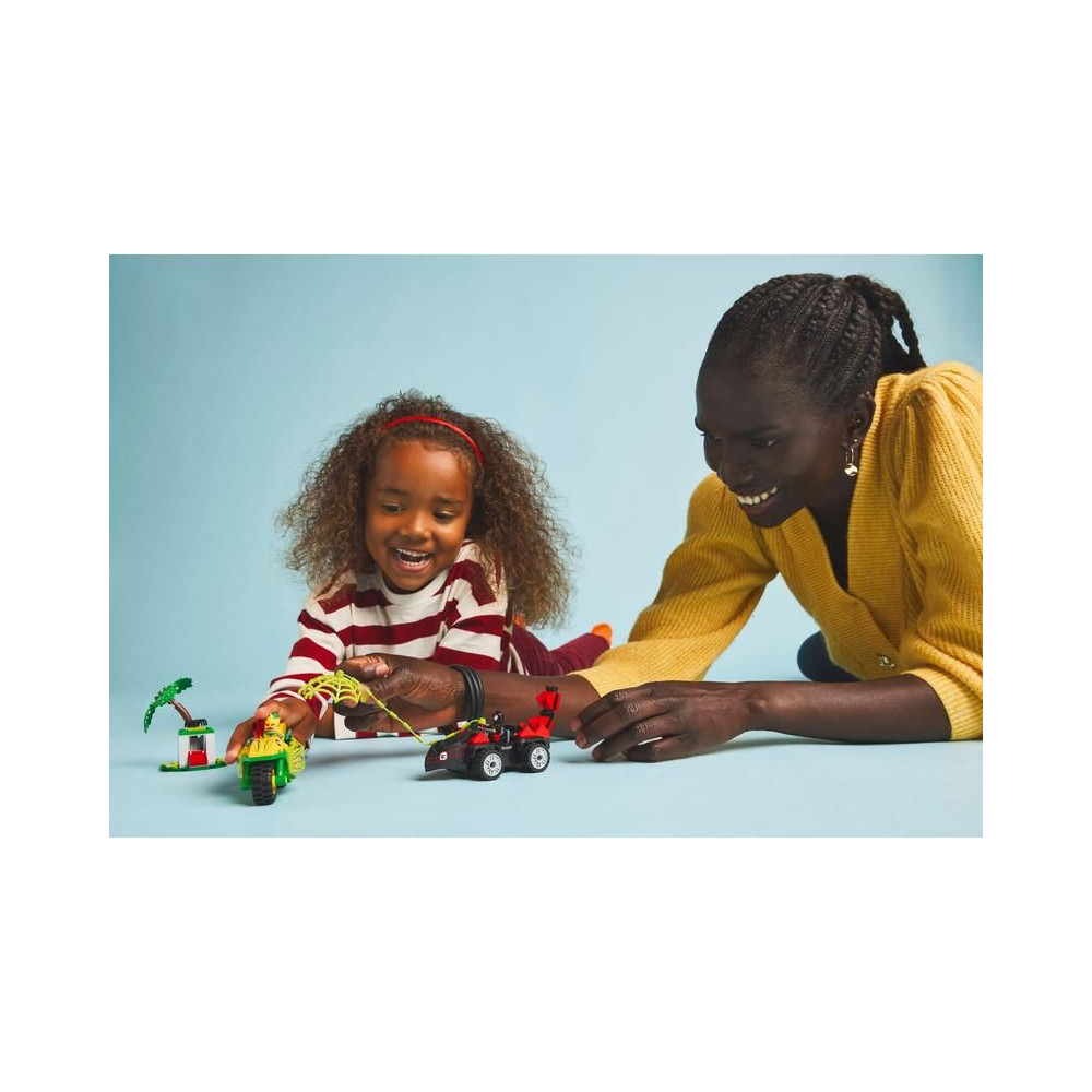 - Építhető LEGO® kalandjátékok húzható járművekkel – A gyerekek csatlakoznak Spinhez a stegosaurus autóban, és üldözik Electrót egy dilophosaurus motorkerékpáron, miután ellop egy ritka kristályt.