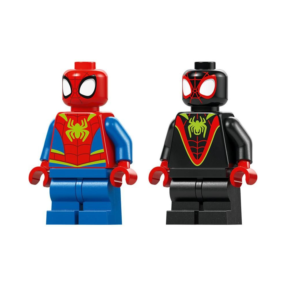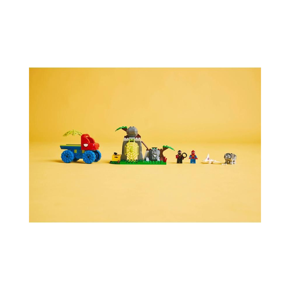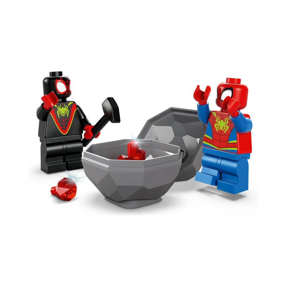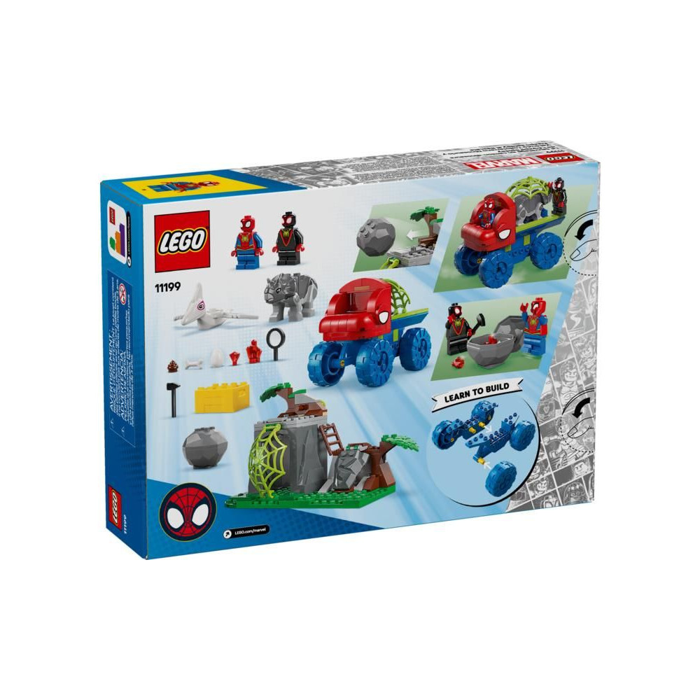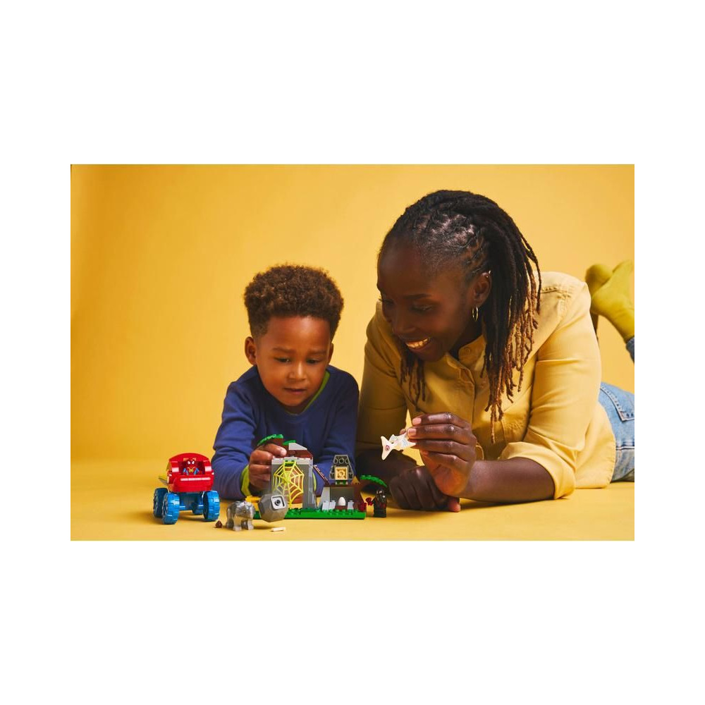 Ez a LEGO® építőkészlet tartalmazza Pókember és Miles "Spin" Morales minifiguráit, valamint 2 összerakható dinoszaurusz figurát: Szellempókot pterodaktilusként és Orrszarvút triceratopsként. A csomagban megtalálod Pókember LEGO teherautóját is, melynek hátuljára egy nagy háló van rögzítve, egy kioldóval vezérelhető kőesés funkciót, egy feltárandó dinoszaurusz tojást és egy hálót, amivel csapdába ejtheted a gonosztevőt. Intuitív utasításokat találsz színes képes útmutató és egy külön zacskó formájában, amelyben kockák és egy nagy kezdőkockát találsz, így a gyerekek azonnal elkezdhetik az építést.