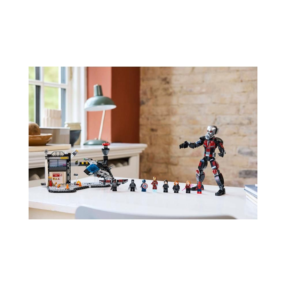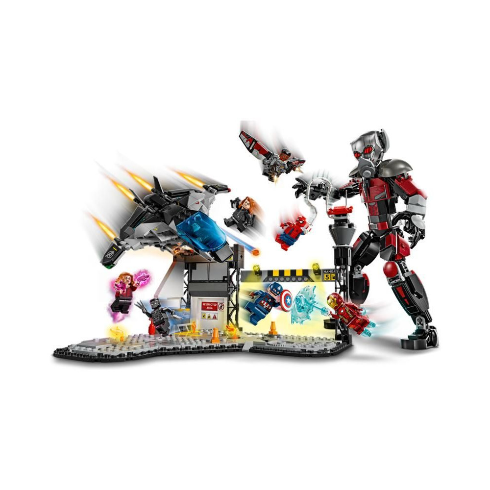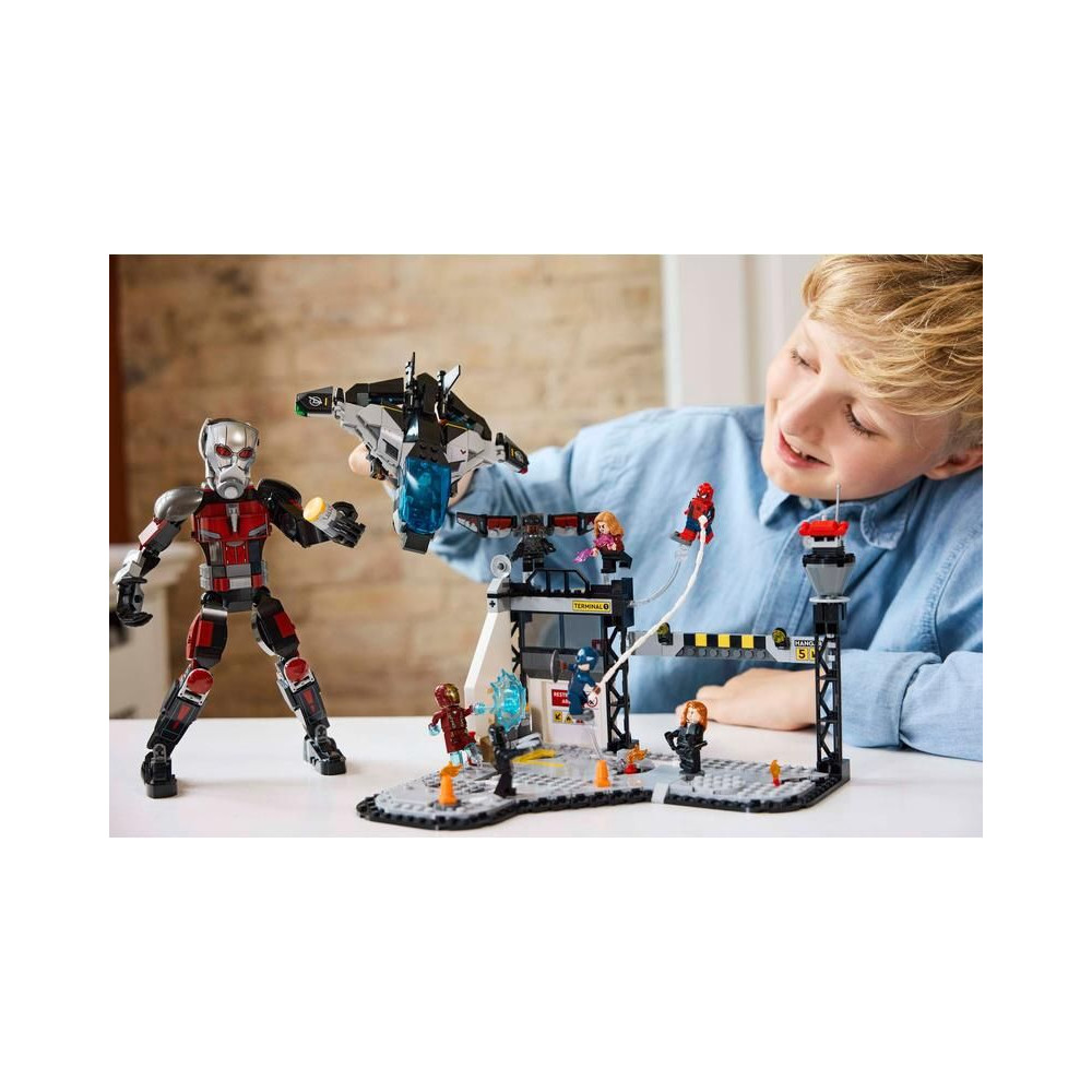 Ezt az építőkészletet a Marvel Studios Amerika Kapitány: Polgárháború című filmjének repülőtéri csatajelenete ihlette. A csomag 8 minifigurát tartalmaz – Amerika Kapitányt, a Tél Katonáját, Wandát, Sólymot, Vasembert, Pókembert, Fekete Özvegyet és Fekete Párducot – fegyverekkel és kiegészítőkkel, valamint egy több mint 24 cm magas, teljesen beállítható Hangyát. A Quinjet repülőgép összecsukható szárnyakkal és nyitható pilótafülkével rendelkezik, amelyben egy pilóta minifigurát lehet elhelyezni. A modell repülőtéri díszletébe beépített robbanó hordó elem egy kis harci hangulatot kölcsönöz a játéknak. A gyerekek a LEGO Builder digitális alkalmazás segítségével építés közben ráközelíthetnek és elforgathatják a modellt.