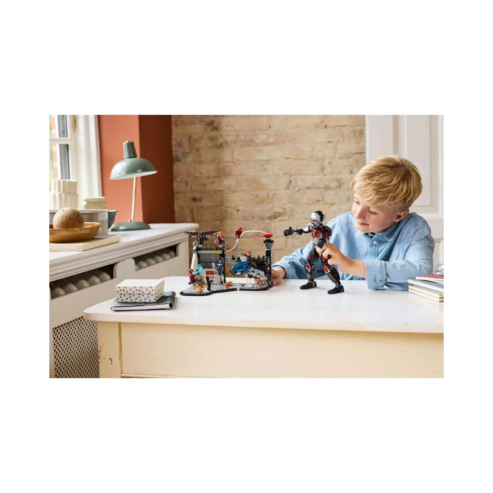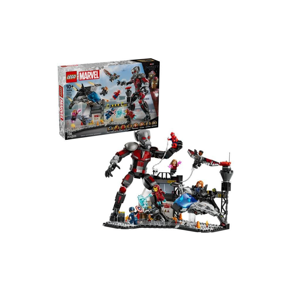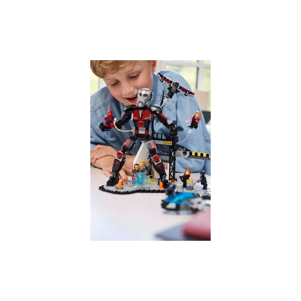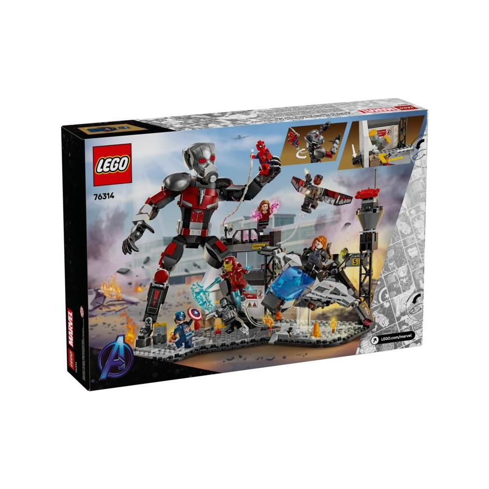 Ezt az építőkészletet a Marvel Studios Amerika Kapitány: Polgárháború című filmjének repülőtéri csatajelenete ihlette. A csomag 8 minifigurát tartalmaz – Amerika Kapitányt, a Tél Katonáját, Wandát, Sólymot, Vasembert, Pókembert, Fekete Özvegyet és Fekete Párducot – fegyverekkel és kiegészítőkkel, valamint egy több mint 24 cm magas, teljesen beállítható Hangyát. A Quinjet repülőgép összecsukható szárnyakkal és nyitható pilótafülkével rendelkezik, amelyben egy pilóta minifigurát lehet elhelyezni. A modell repülőtéri díszletébe beépített robbanó hordó elem egy kis harci hangulatot kölcsönöz a játéknak. A gyerekek a LEGO Builder digitális alkalmazás segítségével építés közben ráközelíthetnek és elforgathatják a modellt.