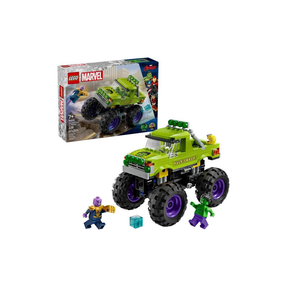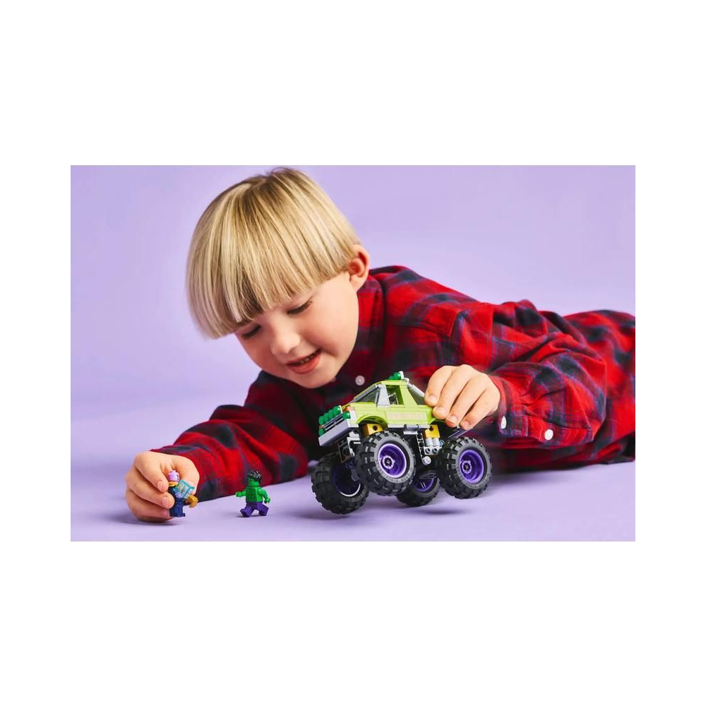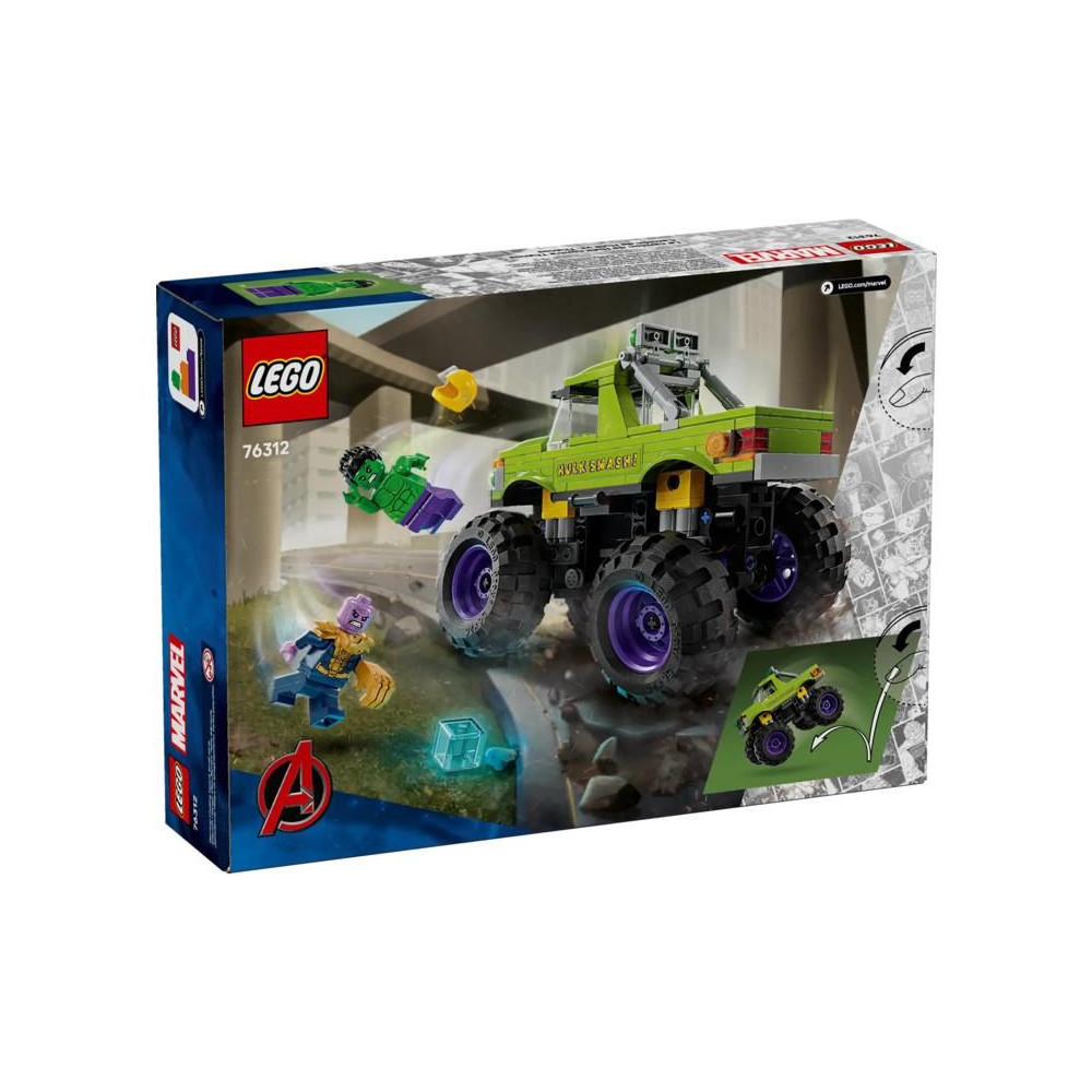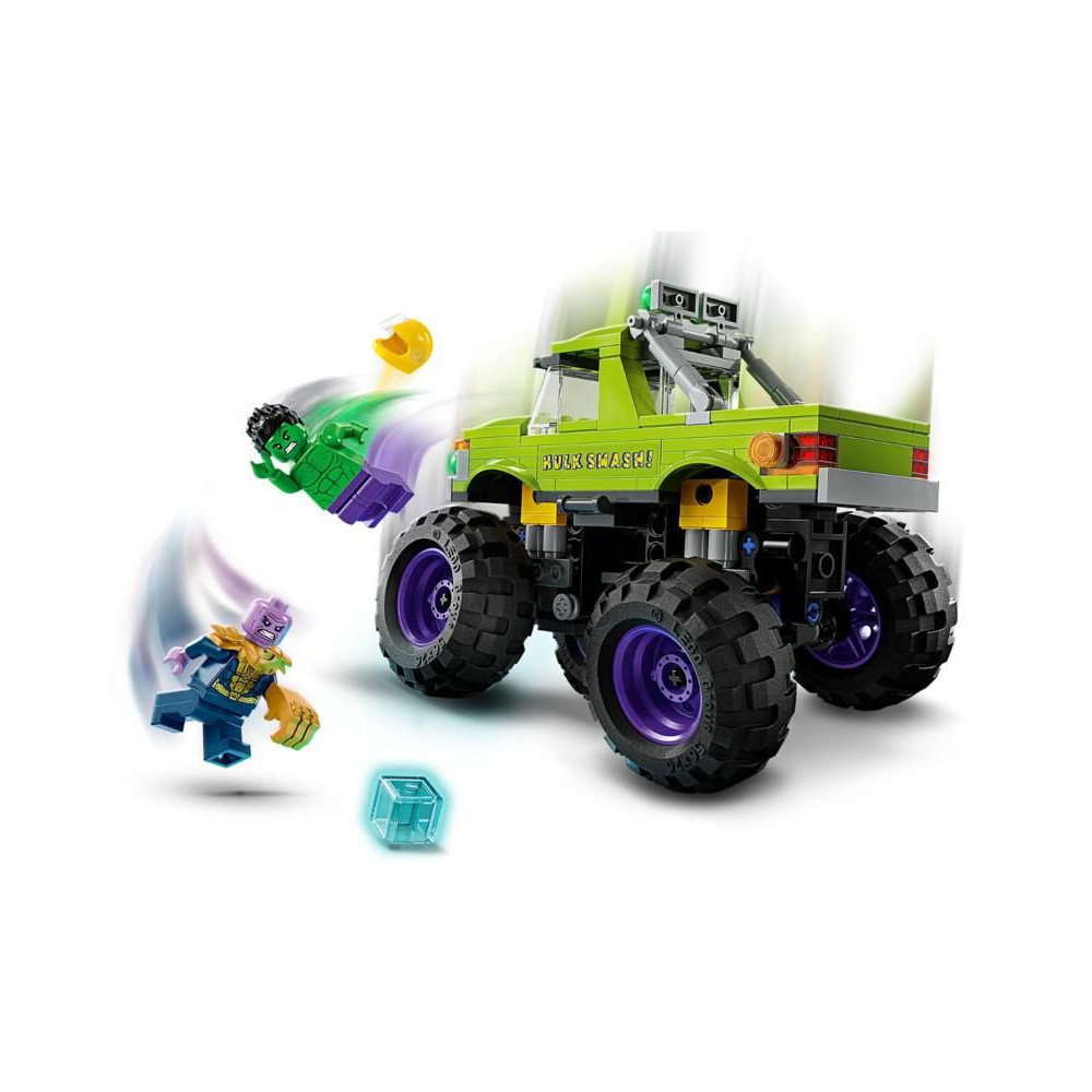Ez a megépíthető LEGO ǀ Marvel erőgépjármű tartalmaz egy Hulk minifigurát levehető sisakkal és egy Thanos minifigurát Tesseracttal és Végtelen Kesztyűvel. A szuperhős teherautó emelhető fülkével rendelkezik, ahonnan megközelíthető a vezetőülés, és van hely egy Hulk minifigura számára. A teherautó külseje zöld, és a "Hulk Smash!" felirat díszíti. és Hulk arca. A nagy, forgó kerekeknek, a robusztus konstrukciónak és a felfüggesztésnek köszönhetően ez a mega teherautó még a legigényesebb feladatokat is képes kezelni. Még több digitális szórakozásért az építők 3D-ben nagyíthatják és forgathatják a modelleket, és nyomon követhetik a haladásukat a szórakoztató és intuitív LEGO Builder alkalmazás segítségével. A modell 229 darabot tartalmaz.