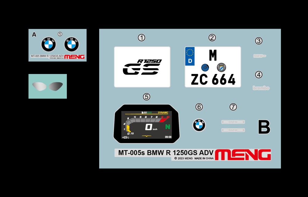 Az MT-005s BMW R 1250 GS ADV "Water Bird" készlet a MENG és a BMW együttműködésének eredménye. Ez egy 1:9 méretarányú modell, amely összeszerelve 253,3 mm hosszú, 105,6 mm széles és 158,4 mm magas. A modell hűen reprodukálja a kéthengeres boxermotort és a jellegzetes acélcső vázat.