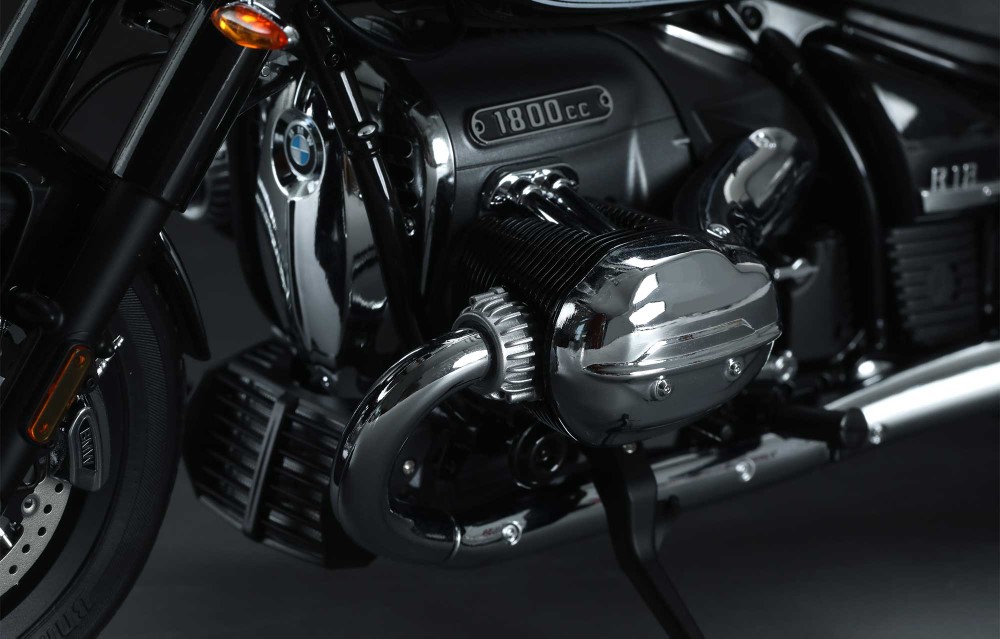 A kéthengeres boxermotor festett és krómozott alkatrészek kombinációja, amelyeket maratott fém matricák egészítenek ki.