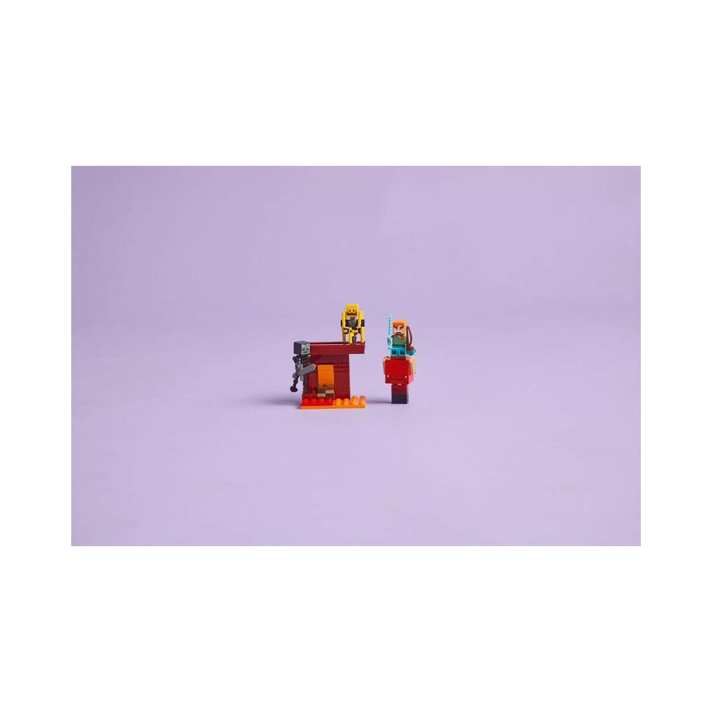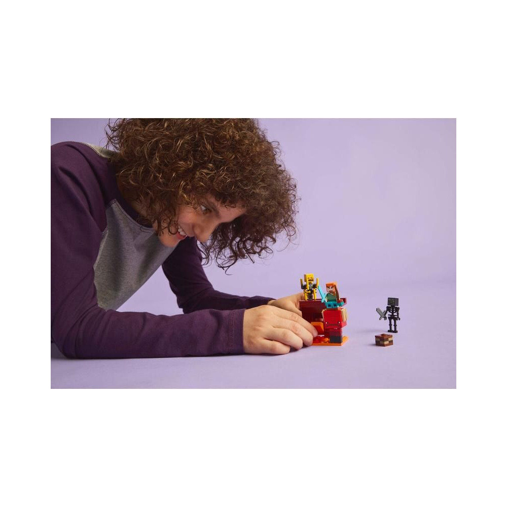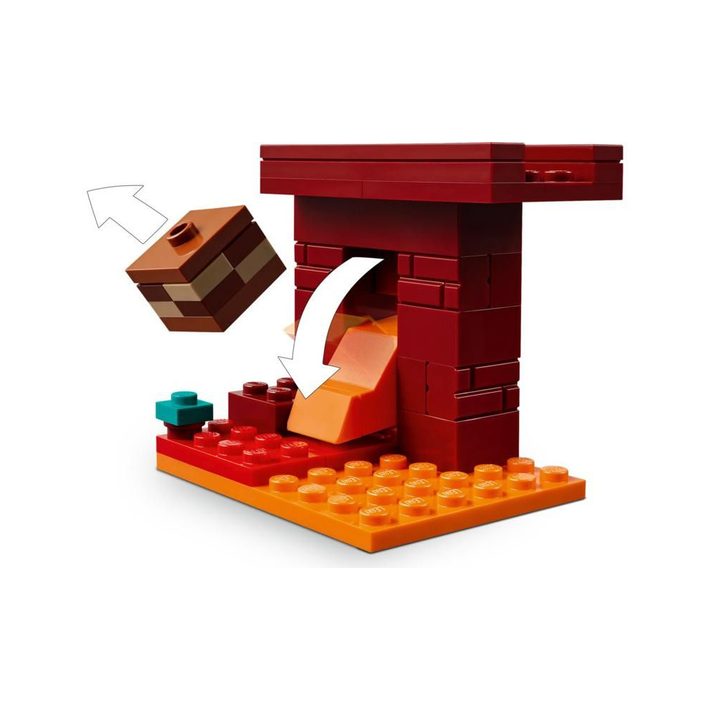 A gyerekek csatlakoznak Alexhez, a Minecraft akcióhőséhez, és együtt eltávolítanak ősi törmelékeket egy híd egy részéről, amely az Alvilágban, a bíborvörös erdőben található erődítményben található. Amikor eltakarítod a törmeléket, a lávaelemek automatikusan lefelé mozogni kezdenek, és Minecraft figurák – egy kőkarddal elsorvadó csontváz és egy forgó rúddal lángoló csontváz – elállják Alex kijáratát. A gyerekek a híres gyémántkarddal harcolhatnak a csőcselék ellen, majd más Minecraft figurákon, mozgatható lábakkal és nyereggel ellátott járókereteken menekülhetnek el. A játékosoknak furcsa gombákat kell szerezniük ahhoz, hogy járókereteket hajthassanak. Még több digitális szórakozásért a LEGO Builder alkalmazás lehetővé teszi a gyerekek számára, hogy 3D modelleket nagyítsanak és forgathassanak eszközeik segítségével.
