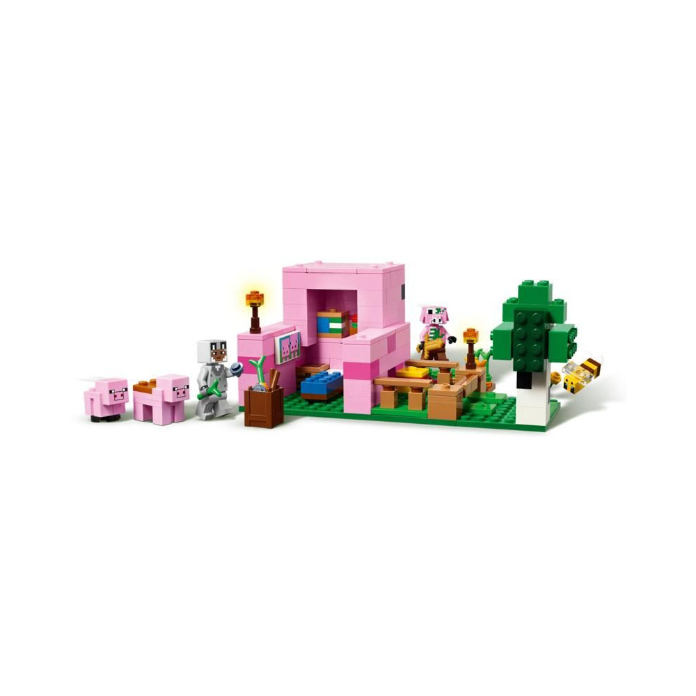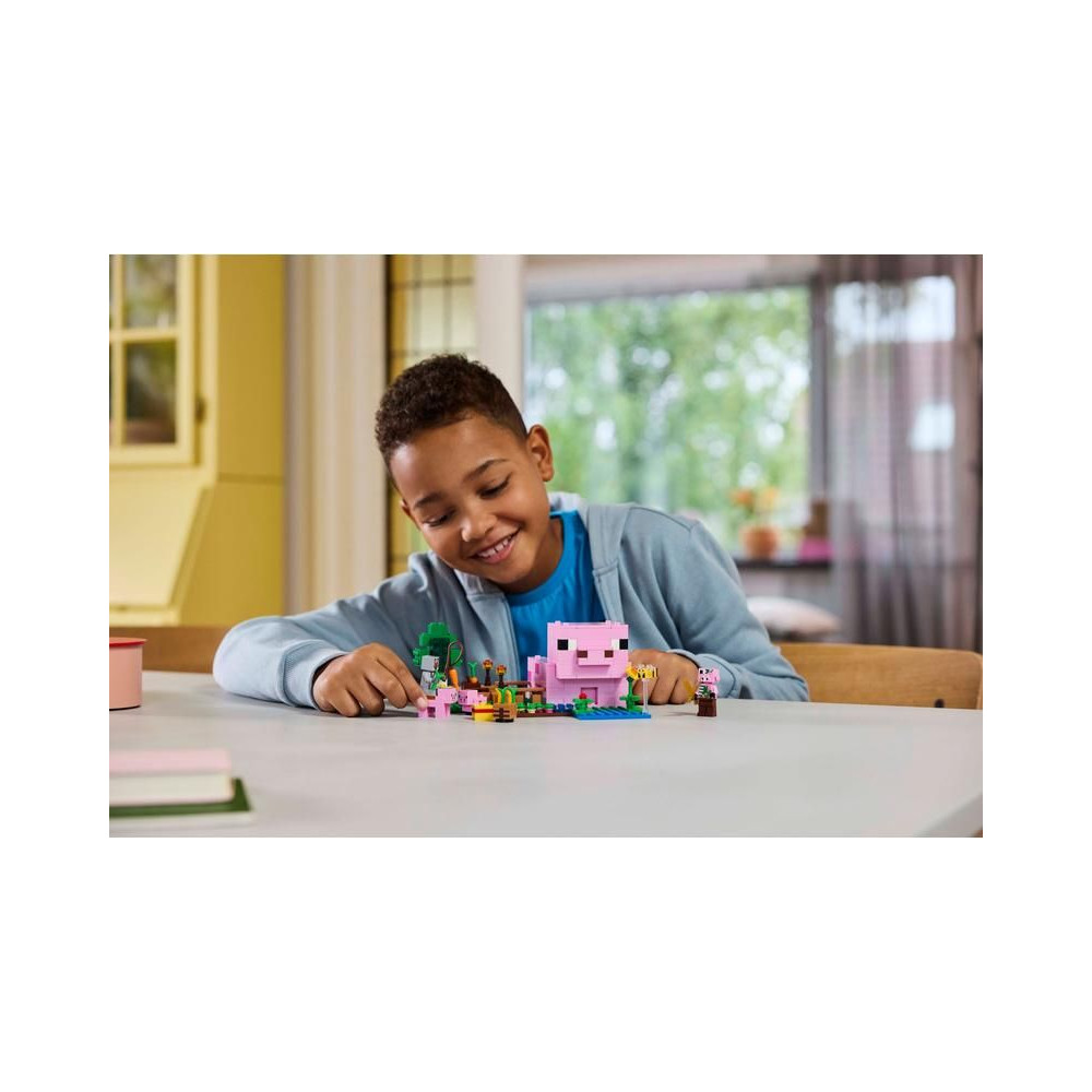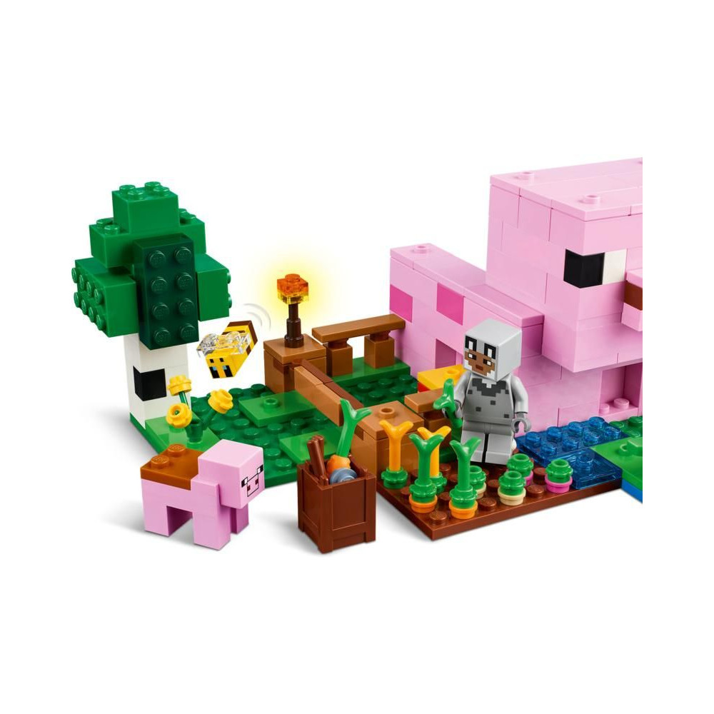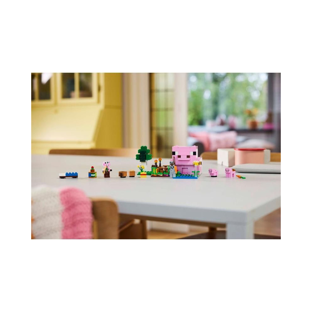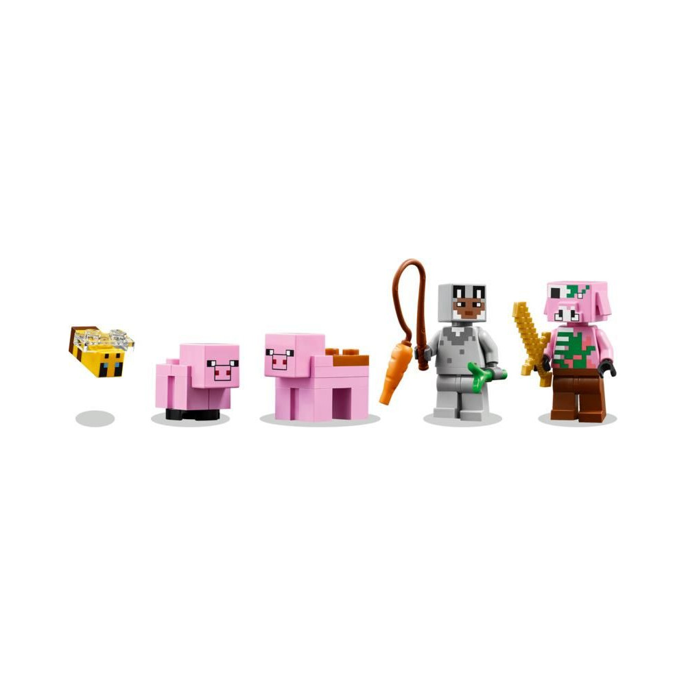 Ez a kreatív építőkészlet a Minecraft játékvilág erdei biomjában játszódik. Számos figurát tartalmaz ebből a népszerű videojátékból: egy farkasbőrbe bújt hősfigurát, egy malacperselyt, egy méhet, egy felnőtt malacot és egy zombifikált malacot. A gyerekek emlékezni fognak a játék pillanataira – például felnyergelhetnek egy felnőtt malacot, és felakaszthatnak rá egy répát, hogy malac formájában lovagolhassanak a kertben és a házban. Tartalmaz egy mezőt, ahol a gyerekek krumplit és céklát termesztenek, valamint egy mezőt egy kapuval, amelyen keresztül be lehet vezetni a disznót. A gyerekek elkerülik a zombiká vált malacot, aki el akarja rontani a szórakozásukat - csak lépjenek be a házba, ahol egy ágyat, egy könyvespolcot és egy íróasztalt találnak, amelyek fantáziadús játékra inspirálnak. A LEGO® Builder alkalmazás további szórakozást kínál a gyerekeknek, akik eszközükkel 3D-ben nagyíthatják és forgathatják a modelleket.