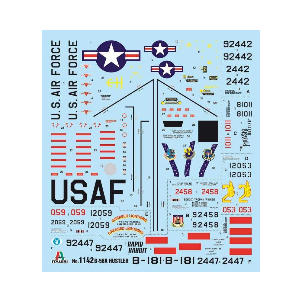 Repülőgépmodell összeragasztásához. Méret: 1:72; 40,9 cm. A csomag a modell 6 változatához szükséges matricákat tartalmazza.