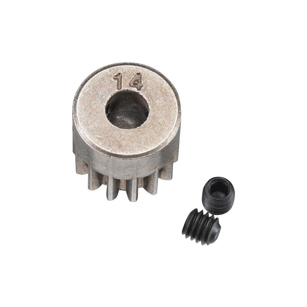 Tengelyes fogaskerék 5 mm-es tengelyhez 14 foggal és 32DP ( 0,8 mm ) fogazott modullal RC modellautókhoz. Szinterezett acélból készült. Csiga mellékelve.