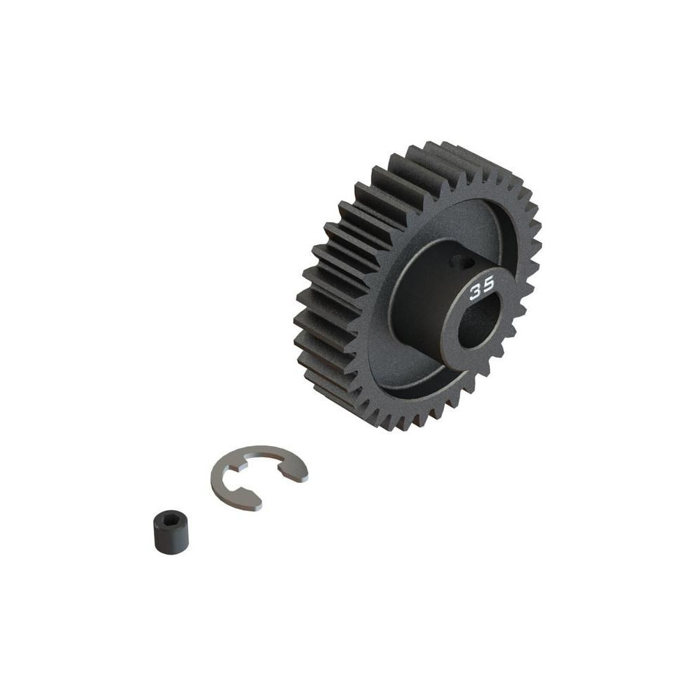 Arrma acél fogaskerék 35 foggal, M1 modul, Safe-D8 furat. A "D" alakú furat illeszkedik a motor tengelyének profiljához 8 mm-es tengellyel és fogazással, ezért a fogaskerék nem tud elfordulni a tengelyen. Állítócsavar - M4 x 4mm, 6mm zégergyűrű. Precíziós, széles fogazású profil a sima futás érdekében.