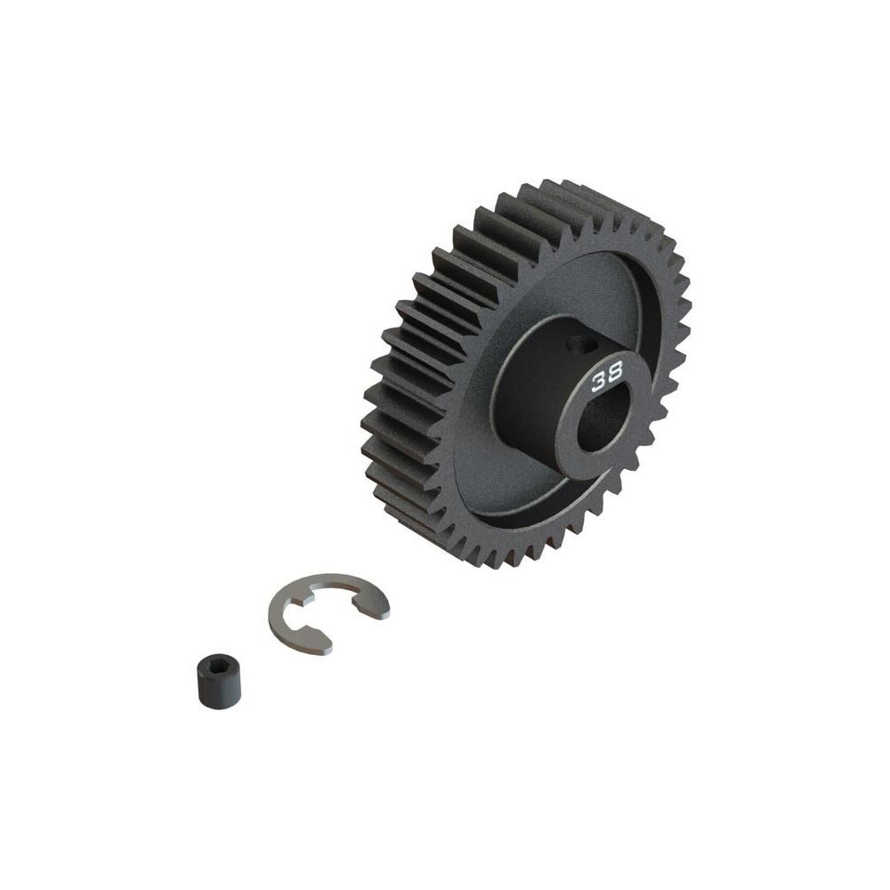 Arrma acél fogaskerék 38 foggal, M1 modul, Safe-D8 furat. A "D" alakú furat illeszkedik a motor tengelyének profiljához 8 mm-es tengellyel és fogazással, ezért a fogaskerék nem tud elfordulni a tengelyen. Állítócsavar - M4 x 4mm, 6mm zégergyűrű. Precíziós, széles fogazású profil a sima futás érdekében.