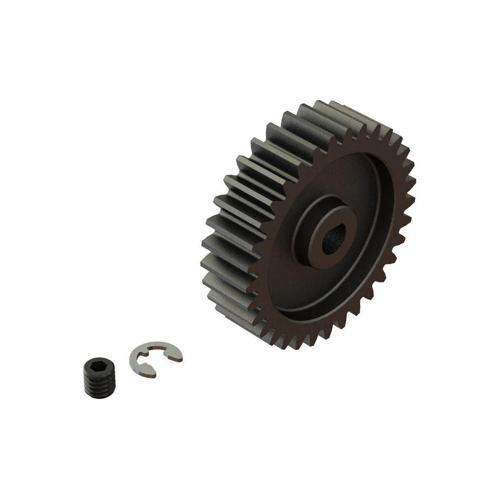 Arrma acél fogaskerék 33 fog, M1 modul, Safe-D5 furat. A "D" alakú furat megfelel egy 5 mm-es tengelyű motortengely profiljának, melyen egy kulcsos horony van, ezért a fogaskerék nem foroghat a tengelyen. Beállítócsavar - M4 x 4mm, 3,2mm-es távtartó. Precíziós, széles fogazású profil a sima futás érdekében.