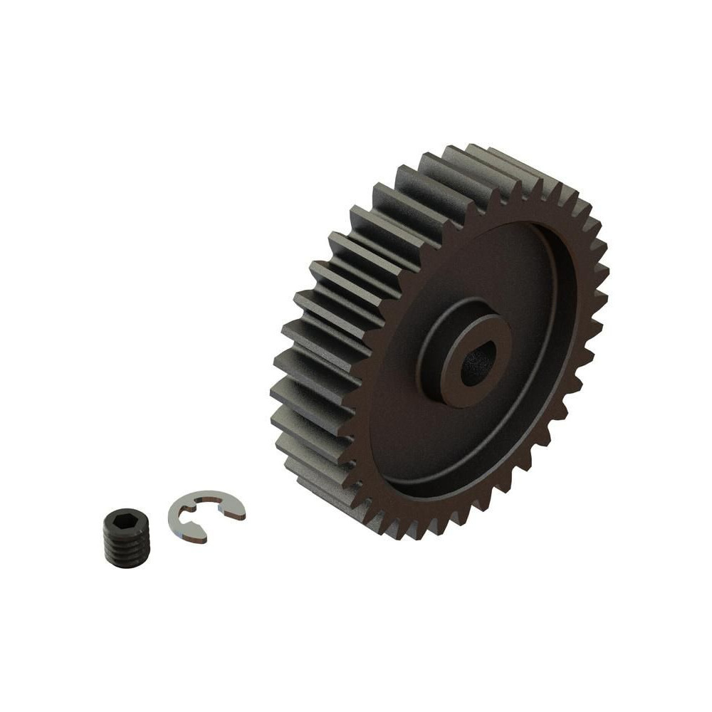 Arrma acél fogaskerék 36 foggal, M1 modul, Safe-D5 furat. A "D" alakú furat megfelel egy 5 mm-es tengelyű motortengely profiljának, amelyhez egy kulcsnyílás tartozik, ezért a fogaskerék nem foroghat a tengelyen. Beállítócsavar - M4 x 4mm, 3,2mm-es zégergyűrű. Precíziós, széles fogazású profil a sima futás érdekében.