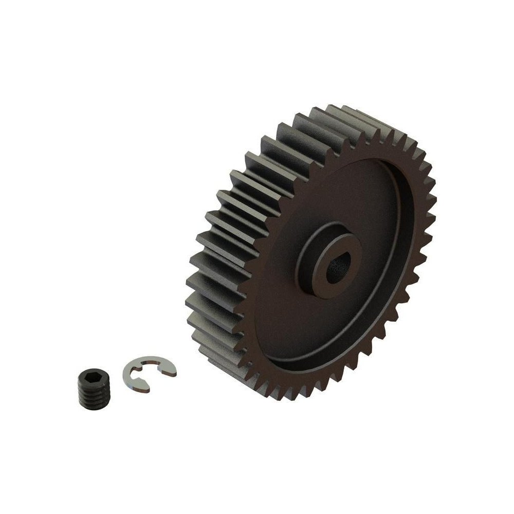 Arrma acél fogaskerék 39 foggal, M1 modul, Safe-D5 furat. A "D" alakú furat megfelel egy 5 mm-es tengelyű motortengely profiljának, amelyhez egy kulcsnyílás tartozik, ezért a fogaskerék nem foroghat a tengelyen. Beállítócsavar - M4 x 4mm, 3,2mm-es zégergyűrű. Precíziós, széles fogazású profil a sima futás érdekében.